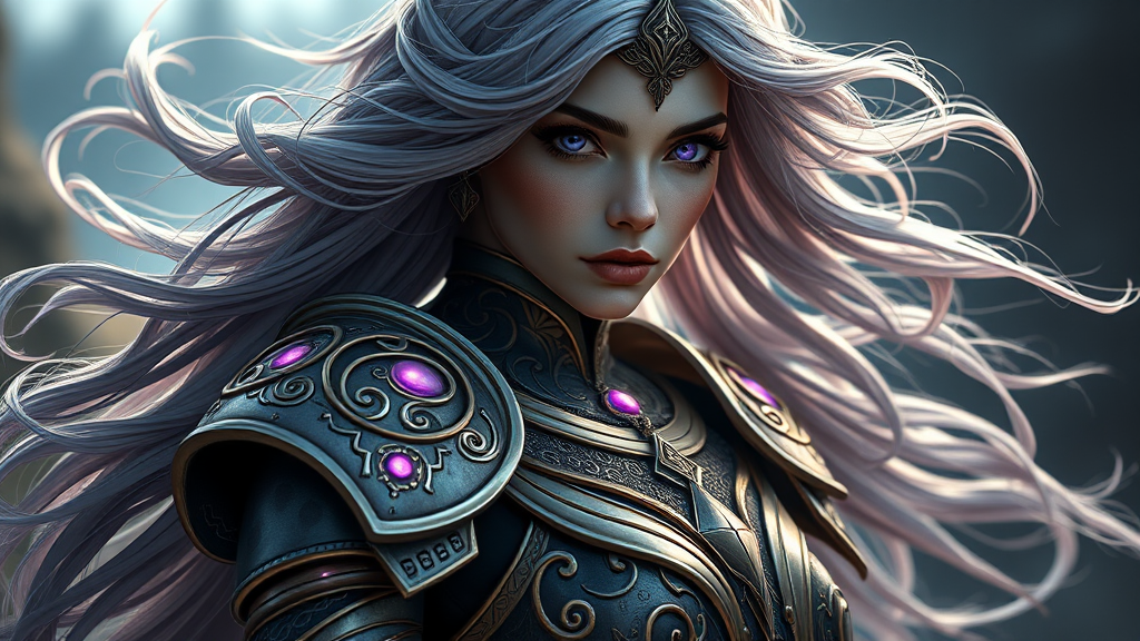 Full body portrait of a game character, an eternal goddess with intricate violet eyes, captured on a Hasselblad H4D 200MS Digital Camera using a Mitakon Speedmaster 65mm f/1.4 XCD lens, inspired by the Dragon Age aesthetic, featuring dramatic Fresnel lighting. The goddess is adorned in elegant, ethereal armor with intricate patterns and glowing runes, set against a mystical, fantasy landscape. Her flowing hair seems to capture the essence of a gentle breeze, subtly shimmering with hues of silver and lavender, exuding an aura of timeless wisdom and power.