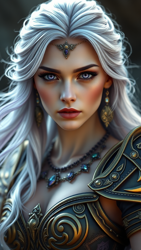 Full body portrait of a game character, an ethereal goddess, showcasing intricate amethyst eyes. Captured with the high-resolution Hasselblad H4D 200MS Digital Camera paired with a Mitakon Speedmaster 65mm f/1.4 XCD lens. The lighting emulates a Fresnel effect, enhancing the mystical aura. Styled akin to the intricate and mythical essence of Dragon Age, the scene is set in a mythical landscape, with the goddess adorned in ornate armor and delicate jewelry, her serene expression conveying timeless wisdom. Her flowing hair, with strands of silver and violet, complements her radiant presence, embodying both power and grace—portrait aspect ratio 1:2.