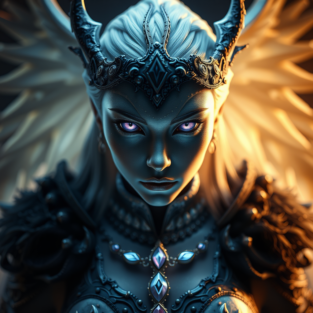 Full body portrait of a game character, celestial deity, featuring intricately detailed violet eyes, captured with the Hasselblad H4D 200MS Digital Camera using a Mitakon Speedmaster 65mm f/1.4 XCD lens, styled reminiscent of Dragon Age, utilizing dramatic Fresnel lighting, ethereal elements subtly added to the attire to accentuate divine presence, maintaining an atmospheric fantasy tone.