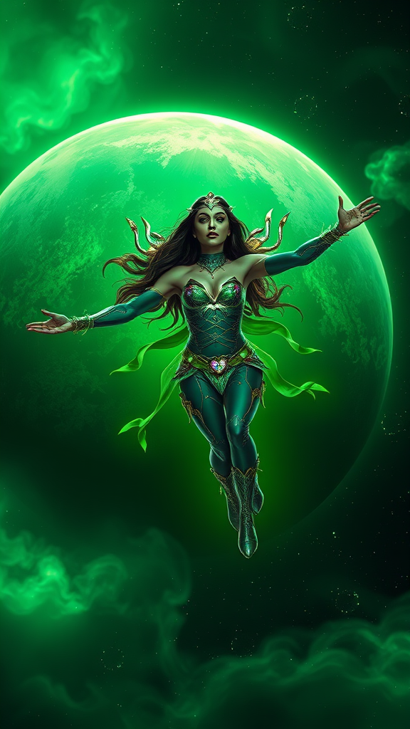 Full body portrait of a game character, hyper-realistic goddess inspired by Poison Ivy, soaring majestically through space. She glides effortlessly in front of a vast, mystical green planet, her powerful features exuding confidence and divinity. Her attire is reminiscent of Poison Ivy’s iconic look, interwoven with celestial elements. The scene is awash with space-colored green, punctuated by vibrant neon and glow-in-the-dark shades. The image is hyper-detailed, as if captured with a Hasselblad H4D 200MS Digital Camera paired with a Mitakon Speedmaster 65mm f/1.4 XCD lens, with dramatic Fresnel lighting enhancing the ethereal atmosphere.