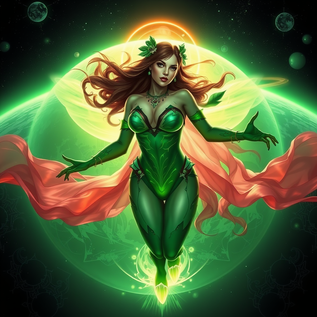 Full body portrait of a game character inspired by Poison Ivy, depicted as a divine entity gracefully floating through the cosmos, set against the backdrop of a mystical, vibrant green planet. Featuring strong, defined features and adorned in attire reminiscent of Poison Ivy's iconic style, the scene is awash with rich, space-themed greens and neon hues that glow luminously in the dark. The hyper-realistic detail is captured as though shot with a Hasselblad H4D 200MS Digital Camera using a Mitakon Speedmaster 65mm f/1.4 XCD lens, with exquisite Fresnel lighting enhancing the divine and ethereal essence of the character in this cosmic setting.