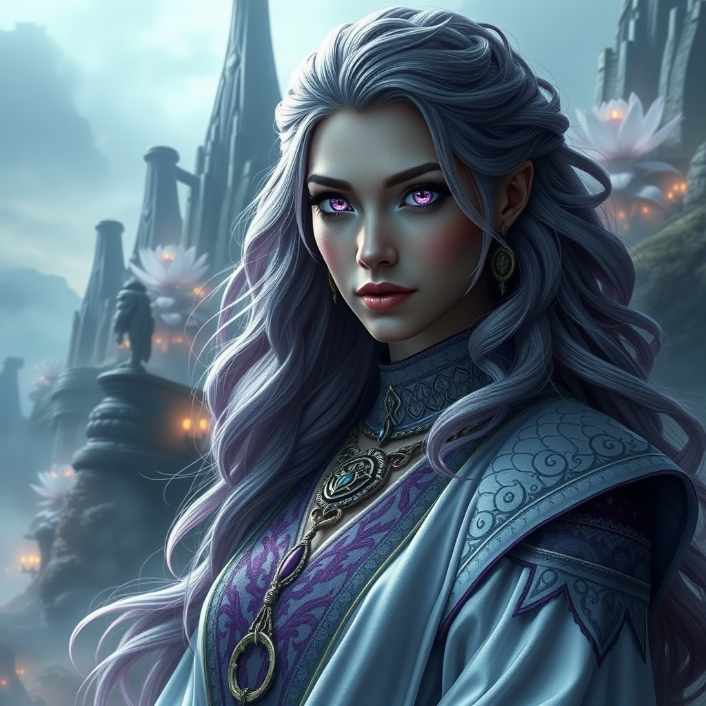Full body portrait of a game character portraying an eternal goddess, with intricate, mesmerizing violet eyes, captured using a Hasselblad H4D 200MS Digital Camera paired with a Mitakon Speedmaster 65mm f/1.4 XCD lens. The style is reminiscent of Dragon Age, utilizing Fresnel lighting to create an ethereal ambience. Her elegant attire includes flowing robes with intricate designs, adorned with ethereal symbols. Her pose is regal yet inviting, with an aura of wisdom and strength. Towering behind her is a mystical landscape, dotted with ancient ruins and glowing flora, accentuating her divine presence. Her hair cascades in waves, blending with the surrounding ethereal mist, further enhancing her otherworldly essence.