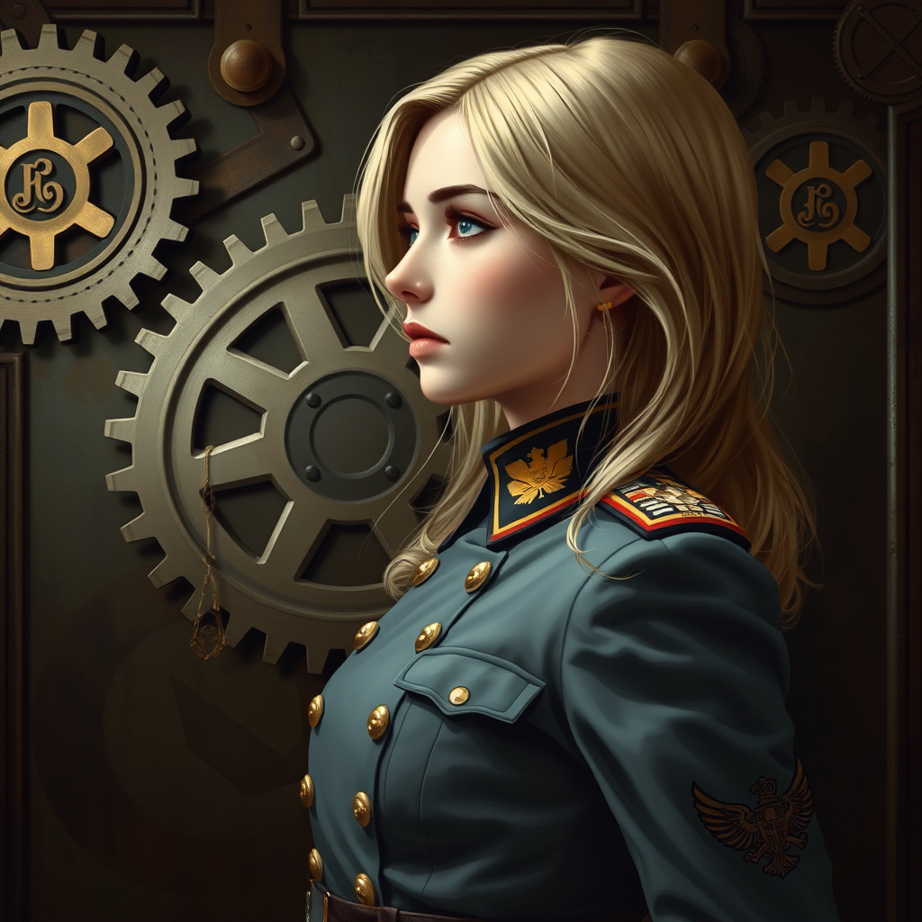 Full body portrait of a girl in an officer's ceremonial tunic with loose blond hair, possessing an aristocratic and model-like face, set in a dieselpunk atmosphere with influences from both the Russian and British empires. The artwork features intricate detailing reminiscent of anime art and showcases a high degree of realism. Cogs and monograms decorate the background, creating a vintage, retro-futuristic ambiance in the style of Ian McQue. The image is set in dark, rich colors and is a high-resolution digital painting, preserving an 8k level of detailing. The side view highlights the character's elegance, embedded with subtle creative elements infusing historical and fantastical aesthetics in a seamless blend.