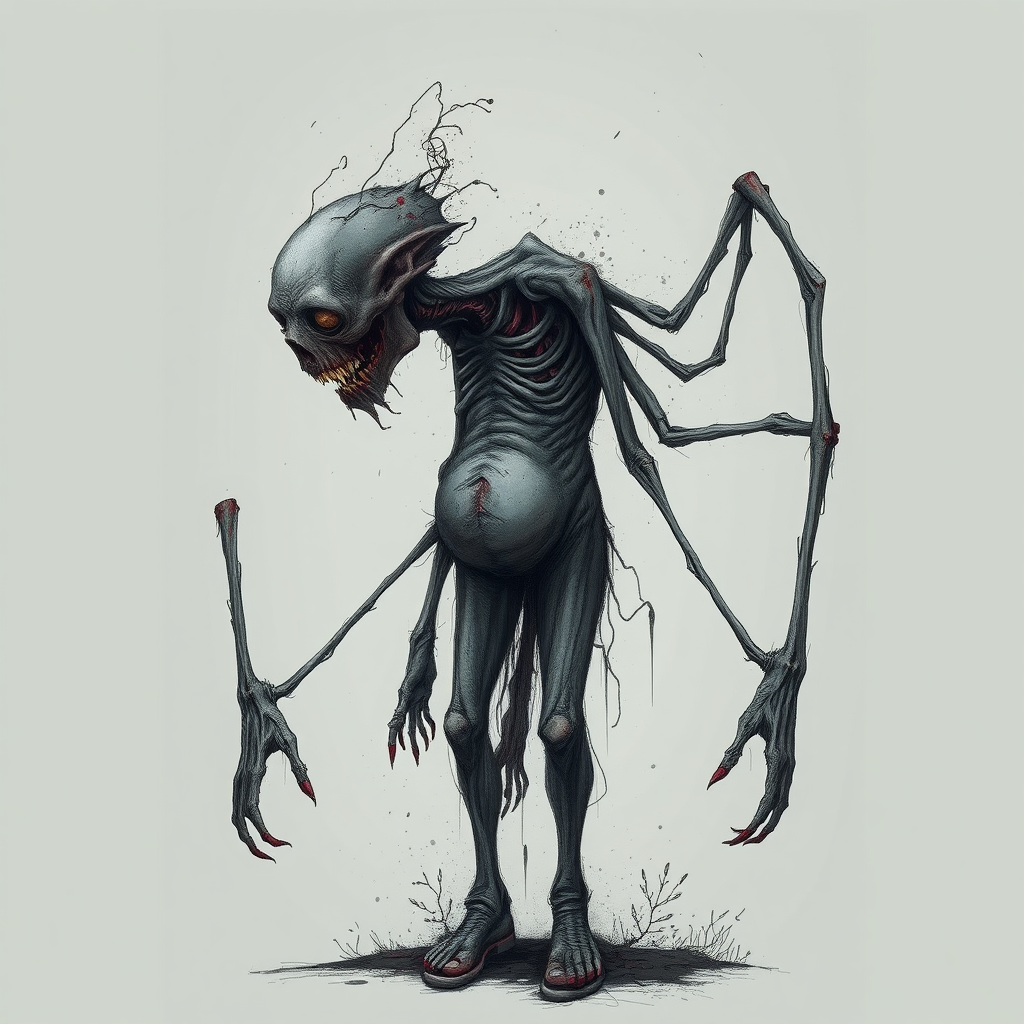 Full body portrait of a grotesque figure, imbued with surrealism and nightmare-like qualities, enveloped in darkness and terror. The figure is illustrated with unsettling lines and particles, reminiscent of the styles of Greg Rutkowski and Yoji Shinkawa, rendered in 4k digital art. Concept art that's trending on artstation for its unnatural anatomy, featuring extra limbs and misshapen proportions. The character possesses a malformed, distorted double head and an elongated neck, with features carelessly drawn: misshapen hands and feet, a corpulent and disfigured form, parts drifting out of frame. The art carries a sense of unease with its intentionally flawed execution, reflecting a haunting and bizarre vision.