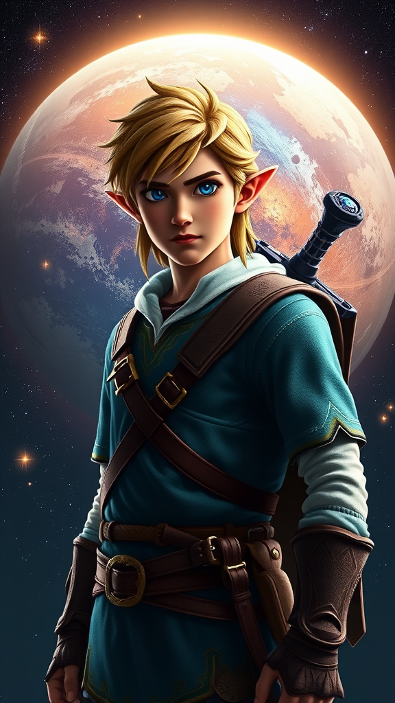 Full body portrait of a movie character, a hyper-realistic depiction of Link from the Breath of the Wild, standing majestically in front of a massive magical planet. His features are strong and god-like, with eyes that seem to hold a universe within them. Dressed in his iconic Breath of the Wild attire, every crease and texture is hyper-detailed, captured with the precision of a Hasselblad H4D 200MS Digital Camera and the artistry of a Mitakon Speedmaster 65mm f/1.4 XCD lens. The backdrop is a vast galaxy, shimmering with a dimensional effect, while Fresnel lighting casts a divine aura around him, highlighting his ethereal presence. Advanced detail and stylistic nuance add depth and realism, creating an epic portrait of this legendary character.