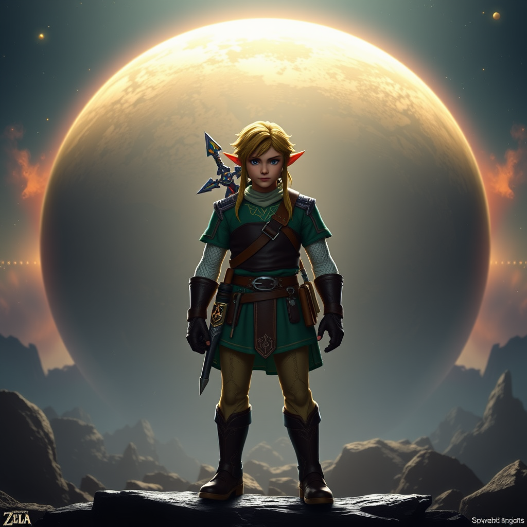 Full body portrait of a movie character, ultra-realistic depiction of Link, positioned majestically in front of a large, mystical planet. Featuring powerful, god-like traits, clad in iconic Breath of the Wild attire, with intricate detailing. Captured using a Hasselblad H4D 200MS Digital Camera equipped with a Mitakon Speedmaster 65mm f/1.4 XCD lens. The scene is set against a cosmic backdrop, enhanced with a dimensional effect and illuminated by Fresnel lighting, evoking a sense of grandeur and epic scale.