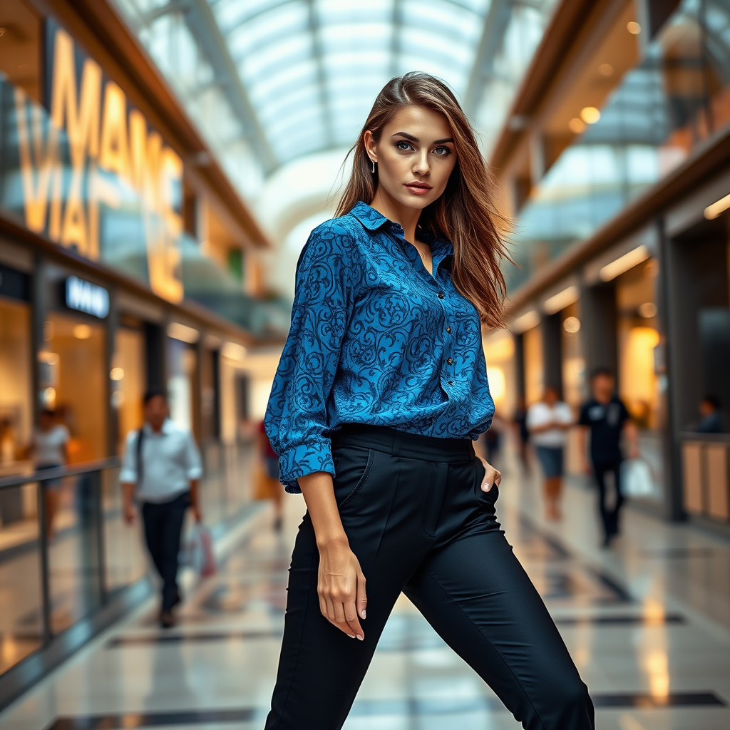 Full body portrait of a striking model with captivating blue eyes, gracefully moving in a vibrant blue batik casual blouse and sleek black trousers, showcasing a modern fashion ensemble, with an artistic touch, exquisite detail, high contrast, set against the bustling backdrop of a sophisticated mall interior.