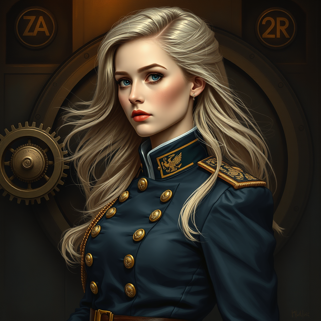 Full body portrait of a young woman in an officer's ceremonial tunic, with flowing blonde hair, embodying a dieselpunk aristocrat aesthetic. Her features are striking like a model's, enhanced by intricate monograms on her attire and in the background. The setting is rich with steampunk elements, including visible cogs and gears. The style is reminiscent of Ian McQue's work, blending influences from the Russian and British empires, rendered in digital painting with dark, vintage colors. The composition showcases max detailing and realism, with a retro-futuristic feel. The scene is captured in 8k resolution, offering an intricate, detailed illustration from a side view perspective, balancing elegance and mechanical elements.