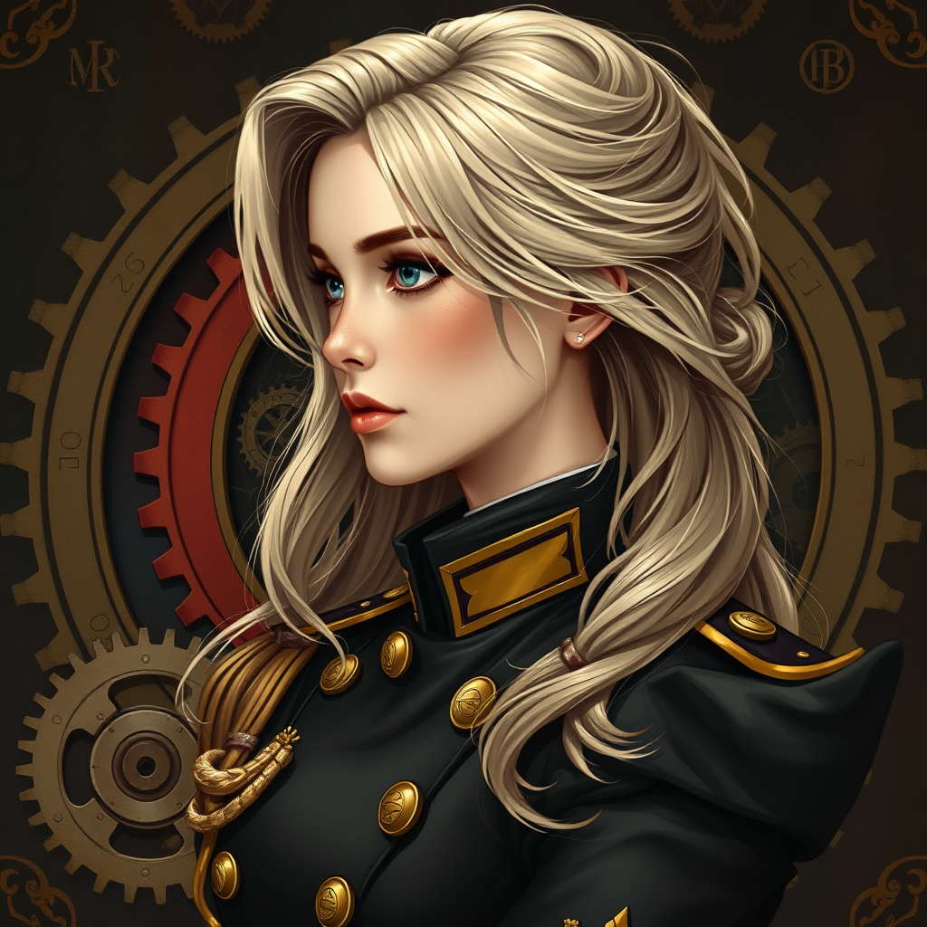 Full body portrait of a young woman in an officer's ceremonial tunic with loose blonde hair, embodying a dieselpunk aristocrat with a model-like face. The scene features intricate anime-inspired art with maximum detailing and realism. Background elements include cogs and ornate monograms, creating an Ian McQue-inspired fusion of Russian and British Empire aesthetics. The digital painting features a dark, vintage, retro-futuristic style, illustrating a richly detailed side view. The composition is rendered in 8k resolution, providing intricate details that capture a timeless elegance intertwined with mechanical innovation.