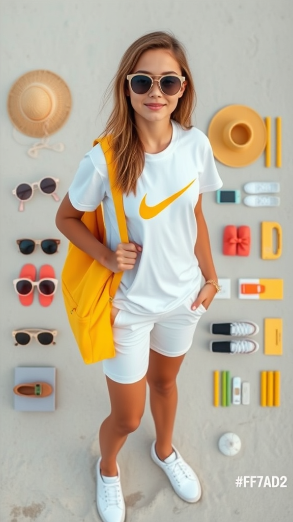 Full body portrait of an American girl with a photorealistic touch, set in an HD, 8k image. She stands confidently at the beach, exuding a chic yet casual vibe. Adorned with a pair of stylish sunglasses, her look is anchored by a classic white T-shirt emblazoned with the iconic Nike logo. Her feet are clad in sleek white sneakers, and she carries a vibrant yellow backpack that adds a pop of color to her ensemble. The shot, composed with a bird's-eye view, reveals a knolling arrangement around her, with beach-themed items meticulously organized, each in different shades harmonizing with a main color palette of #ff7ad2. Text description and data visualization subtly enhance the scene, seamlessly integrated into the composition for an artistic flair that maintains the essence of the original concept.