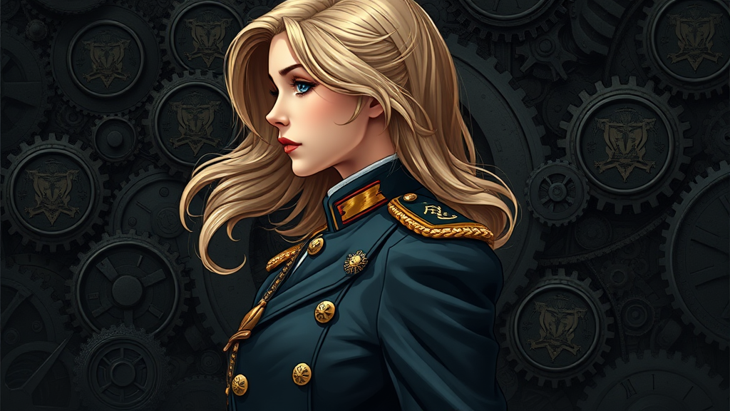 Full body portrait of an elegant girl in a ceremonial officer's tunic, her loose blond hair cascading, embodying a dieselpunk aristocrat with a model's poise. Featuring intricate monograms, the illustration captures her in an anime art style, emphasizing maximum detailing and realism. The background teems with cogs and monograms, reflecting an Ian McQue influence. The aesthetic blends elements of the Russian and British empires, utilizing digital painting techniques with dark, muted color tones. This 8k resolution artwork showcases a vintage, retro-futuristic style in an intricately detailed side view illustration.