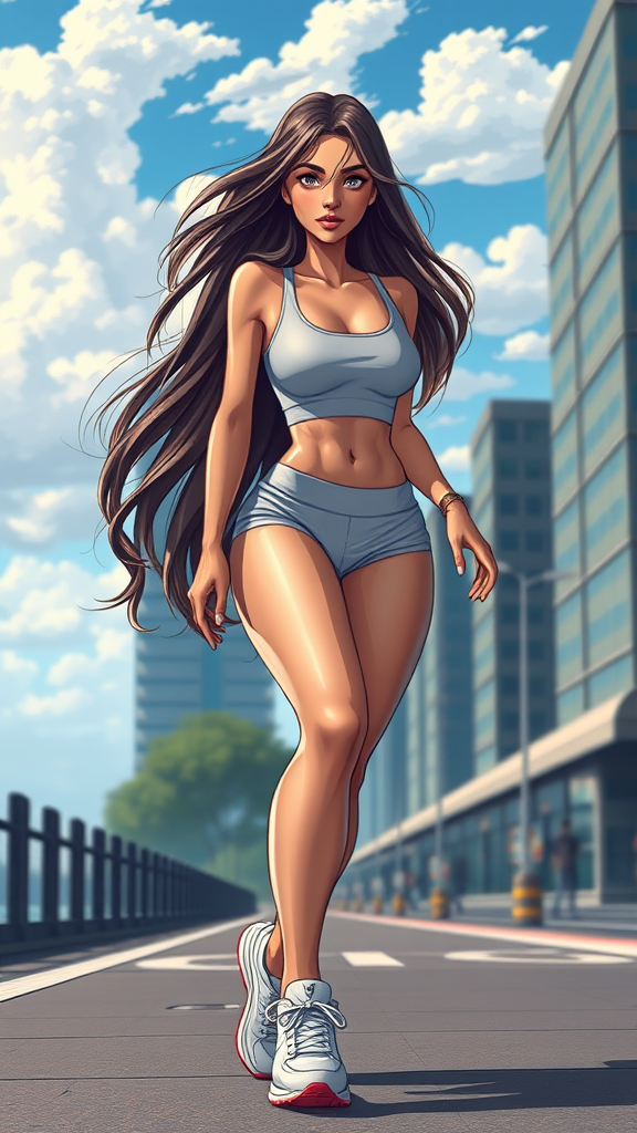 Full body portrait of an exceptionally beautiful fitness girl walking downtown, featuring long flowing hair and a detailed symmetrical face with reflective eyes. The scene is enriched with detailed lighting, rim lighting, dramatic lighting, and chiaroscuro, set against a backdrop of a blue sky and white clouds. She wears white sneakers and showcases a toned physique, emphasizing her strong thighs. The style is inspired by John Constable, Ed Blinkey, Atey Ghailan, Jeremy Mann, Greg Manchess, and Antonio Moro, making it a trending piece on ArtStation and CGSociety. The artwork is intricate and high detail, capturing a dramatic ambiance and is popular on Instagram. The setting includes a serene environment with a lake, ocean, and river. A canvas frame adds to its artistic value, as it's rendered in a cartoon and 3D aesthetic, avoiding weird colors and ensuring clarity without blurriness. The artistic execution ensures perfect anatomy and proportions with no extra or mutated limbs and hands, and maintaining a beautifully crafted face and body in frame, achieving a refined piece without Photoshop errors, tiling, or poor anatomy.