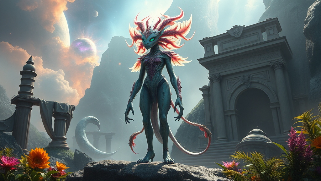 Full body portrait of an exquisite fantasy creature, radiant and ethereal, captured in stunning professional photography. A true masterpiece crafted with the artistic flair of Jean Ansell, Justin Gerard, and Greg Rutkowski, featuring ultra-high detail rendered within the realms of Unreal Engine. Set on a fantastical planet, this scene is a visual wonder, a dreamlike vision with dynamic lighting that dances across lush plants and vibrant fauna and flora. The creature stands amidst cinematic vistas adorned with ancient, weathered ruins, enveloped in swirling colored nebulas and mystical mists, creating an enchanting atmosphere that is both fantastic and timeless.