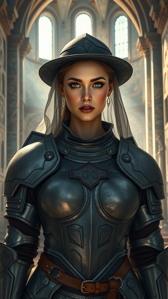Full-body portrait of an exquisitely beautiful woman, known as the most beautiful in the world, standing confidently in a ruined cathedral. She is a striking sister of battle, holding her ground with a commanding presence. Her face is symmetrical and detailed, with reflective eyes, dark, expressive eyebrows, and expertly applied makeup. Her armor is battle-worn and bears the marks of previous conflicts with noticeable cracks and dirt smudges. The setting around her features ruined marble walls, dust particles floating in the dramatic lighting, and evident bullet holes. The composition is inspired by the grand oil paintings of Waterhouse, John Constable, and others, capturing an impressionistic yet realistic style. The lighting is intricate, highlighting the woman and casting dramatic shadows. The woman wears a veil under a hat, integrated with the steel armor in a harmonious fashion. The artwork is designed to be intricate and high in detail, reflecting trending styles on platforms like ArtStation and CGSociety.