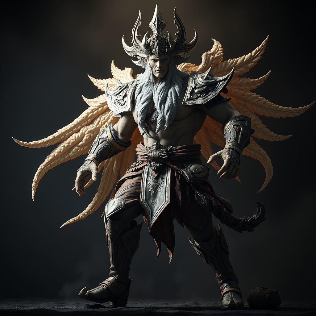 Full body portrait of an imposing game character, fierce deity, in mid-stride, highly detailed, captured with a Hasselblad H4D 200MS Digital Camera, using a Mitakon Speedmaster 65mm f/1.4 XCD lens, illuminated by dramatic Fresnel lighting, --q 4 --ar 1:2 --seed, subtle creative enhancements to emphasize power and divinity.