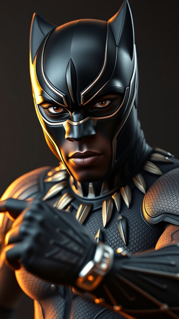 Full Body Portrait of Chadwick Boseman as Black Panther, striking a powerful pose, vibrant and detailed, cinematic lighting, trending on Artstation, 8k, Hyperrealistic, focused, intricate details, crafted in Unreal Engine 5, cinematic masterpiece, with unique artistic expressions in anatomy, dynamic composition, surreal elements, vivid colors, experimental forms, showcasing a blend of realism and imagination, mysterious gaze, innovative style, conceptual charm, emotive presence, hint of abstract, artistic depth and creative flair.