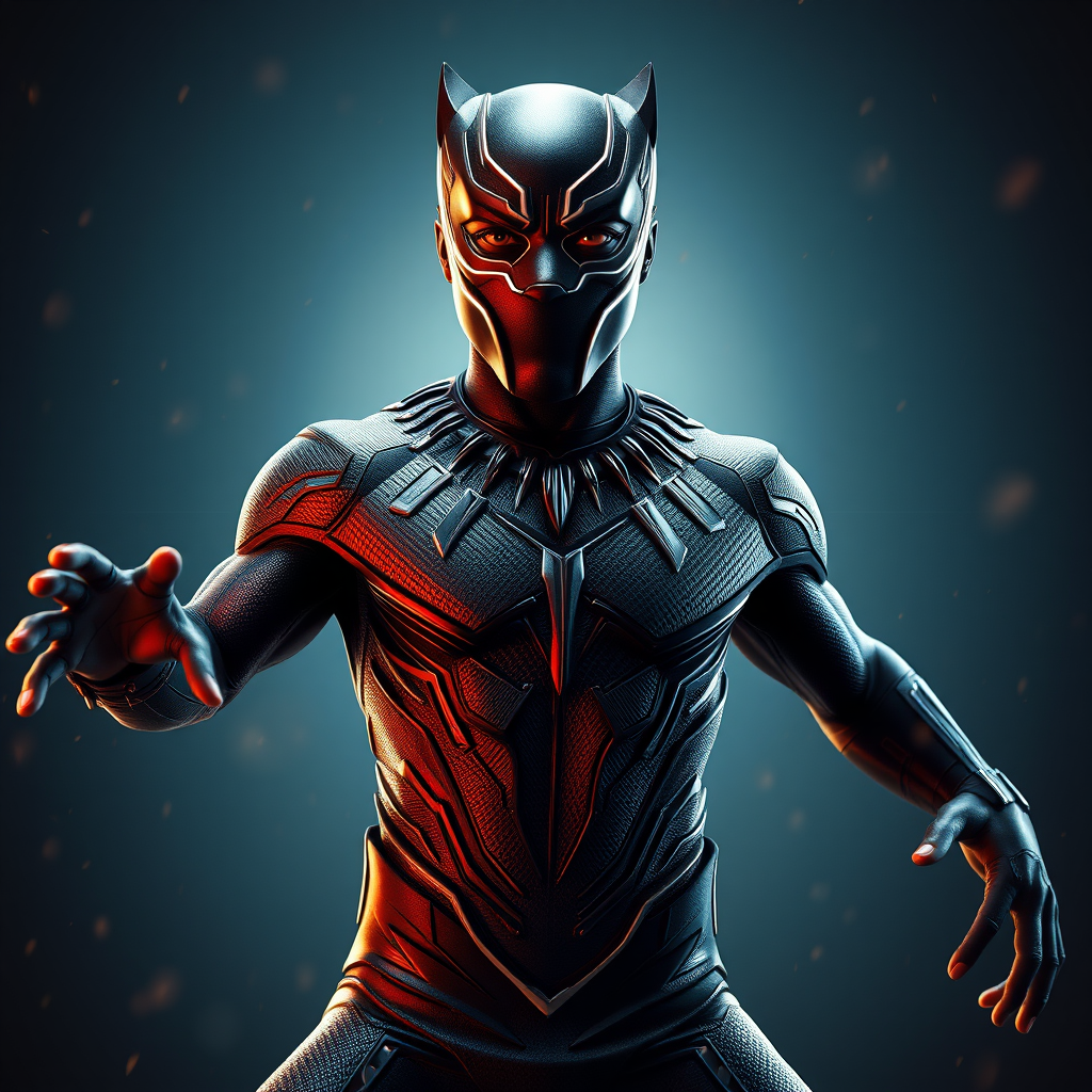 Full Body Portrait of Chadwick Boseman as Black Panther in a striking pose, capturing intricate details and vibrant colors with cinematic lighting, hyperrealistic focus, and extreme details, crafted using Unreal Engine 5 to create a cinematic masterpiece. Despite these qualities, the artwork presents unique elements such as tiling, inconsistencies in anatomy, and softness in focus, with a slightly surreal touch to hands, feet, and facial features. The body may extend out of frame, introducing an artistic blur, while maintaining a sense of dynamic motion. Subtle imperfections are embraced, adding a layer of artistic distortion, such as extra limbs or playful proportions, conveying a fantastical narrative. Capture the essence of a hero in a parallel yet imperfect universe, where the fluidity of motion and the nuances of expression tell a story beyond conventional realism, all while avoiding unwanted technical distractions like watermarks or text logos.