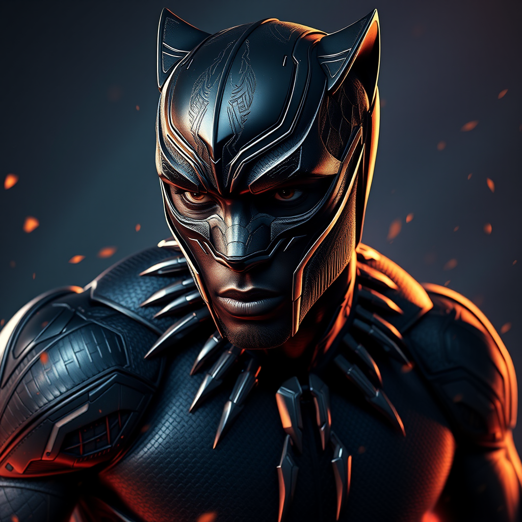 Full body portrait of Chadwick Boseman as Black Panther, in a powerful pose, intricate and vibrant, cinematic lighting, trending on Artstation, hyperrealistic with extreme details, created using Unreal Engine 5, artistic masterpiece, focused and detailed, full of depth and color, slightly imperfect in anatomy, with subtly exaggerated features for artistic effect, dynamic composition, slightly abstract with imaginative elements, unique interpretation, evocative expression, immersive and engaging, maintaining the essence of an epic and heroic character.