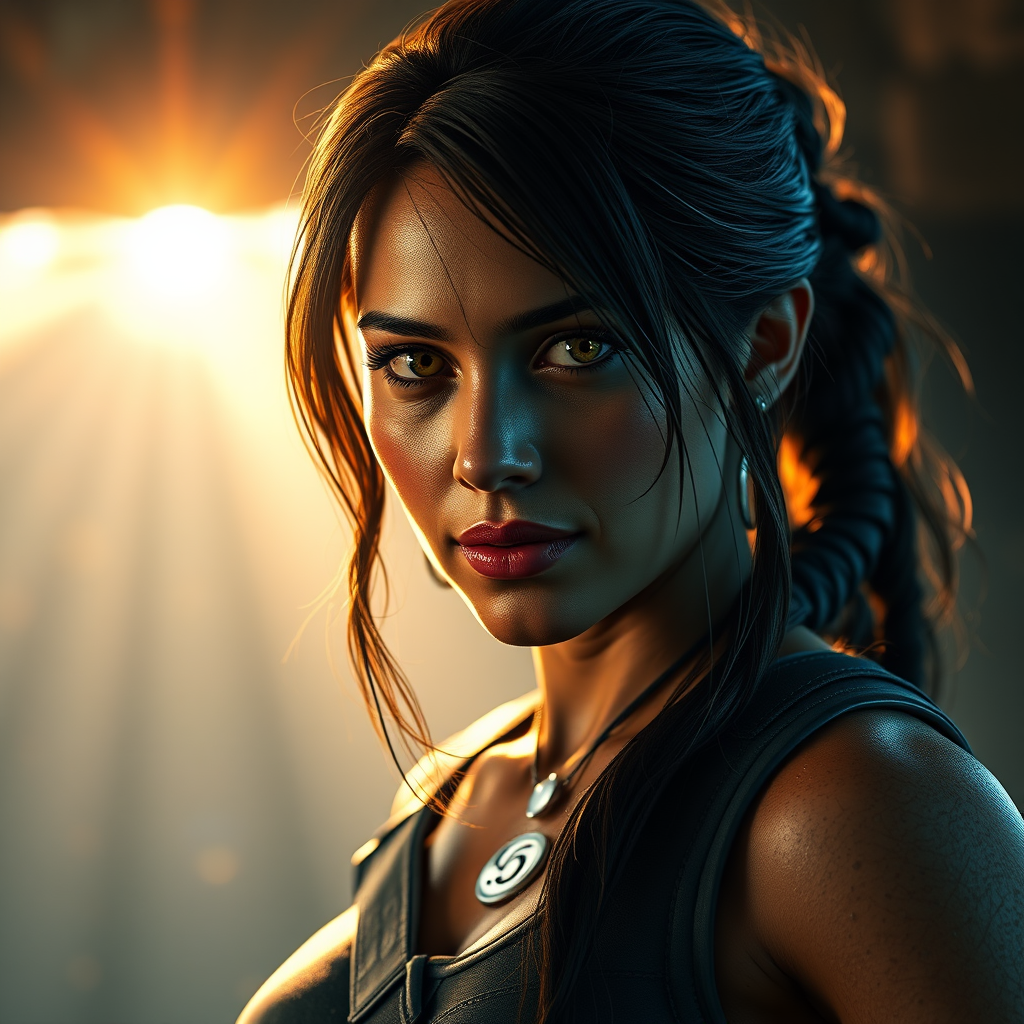 Full body portrait of Jessica Alba as Lara Croft tomb raider, capturing her in an 8k hyperrealistic style with cinematic lens flare and atmospheric glow, showcasing intricate details and vibrant colors under dramatic lighting. This piece is designed to trend on artstation, using 4k resolution to enhance its hyperrealistic focus and extreme detail quality. Created with Unreal Engine 5, this cinematic masterpiece highlights lumen reflections and sophisticated photography in a stunning 3D environment. Rendered with Octane for hyperrealism CGI, the piece exudes a lifelike quality while embracing the dynamic energy of the tomb raider world. Despite the occasional abstract elements like distorted features or extra appendages, this depiction remains faithful to its adventurous spirit and engaging narrative, presenting a visually striking image with hints of surrealism.
