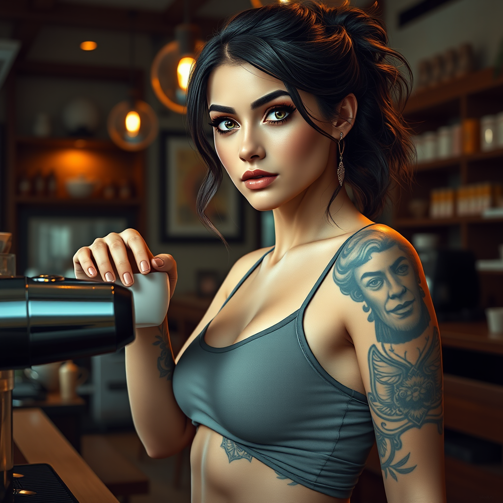 Full body portrait of the most captivating barista girl in the world, featuring a detailed symmetrical face and expressive eyes highlighted with mascara and makeup, accentuating her charming and prominent cheekbones. Set in a cozy café with modern interior design, this scene captures her serving coffee with a graceful demeanor. Her reflective eyes and intricate tattoos are highlighted by dramatic chiaroscuro and rim lighting, bringing depth to her character. She exudes confidence, revealing her defined midriff and stomach muscles, reminiscent of a modern-day impressionistic masterpiece. Influences from Waterhouse, John Constable, Ed Blinkey, Atey Ghailan, Studio Ghibli, Jeremy Mann, Greg Manchess, and Antonio Moro meld into a single artistic vision, popular on platforms like ArtStation and CGSociety. This high-detail, dramatic depiction plays on a canvas of nuanced colors, reminiscent of Makoto Shinkai Kyoto's breathtaking visuals, avoiding any distracting details such as extra limbs or disfigured shapes. The focus remains on the beauty and elegance of the barista, captured in an ideal frame with perfect anatomy and an inviting atmosphere.