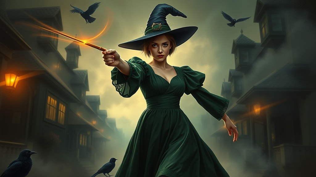 Full body portrait of the most powerful witch in the world, aiming wand, beautiful witch woman casting a spell, walking towards the camera, short hair, wearing mascara with reflective eyes and makeup, surrounded by fog, cute nose, illuminated by rim lighting with dramatic chiaroscuro effects, featuring puffy sleeves in a gothic Victorian town with crows scattered around. The piece is a professional majestic impressionism oil painting inspired by Waterhouse, John Constable, Ed Blinkey, Atey Ghailan, Jeremy Mann, Greg Manchess, and Antonio Moro. The artwork is trending on ArtStation and CGSociety, capturing intricate high detail and drama akin to Makoto Shinkai Kyoto. The witch is elegantly dressed in a green dress, set against a canvas frame, capturing an essence that blends realism with slight cartoon and 3D elements while ensuring cohesive and harmonious composition.