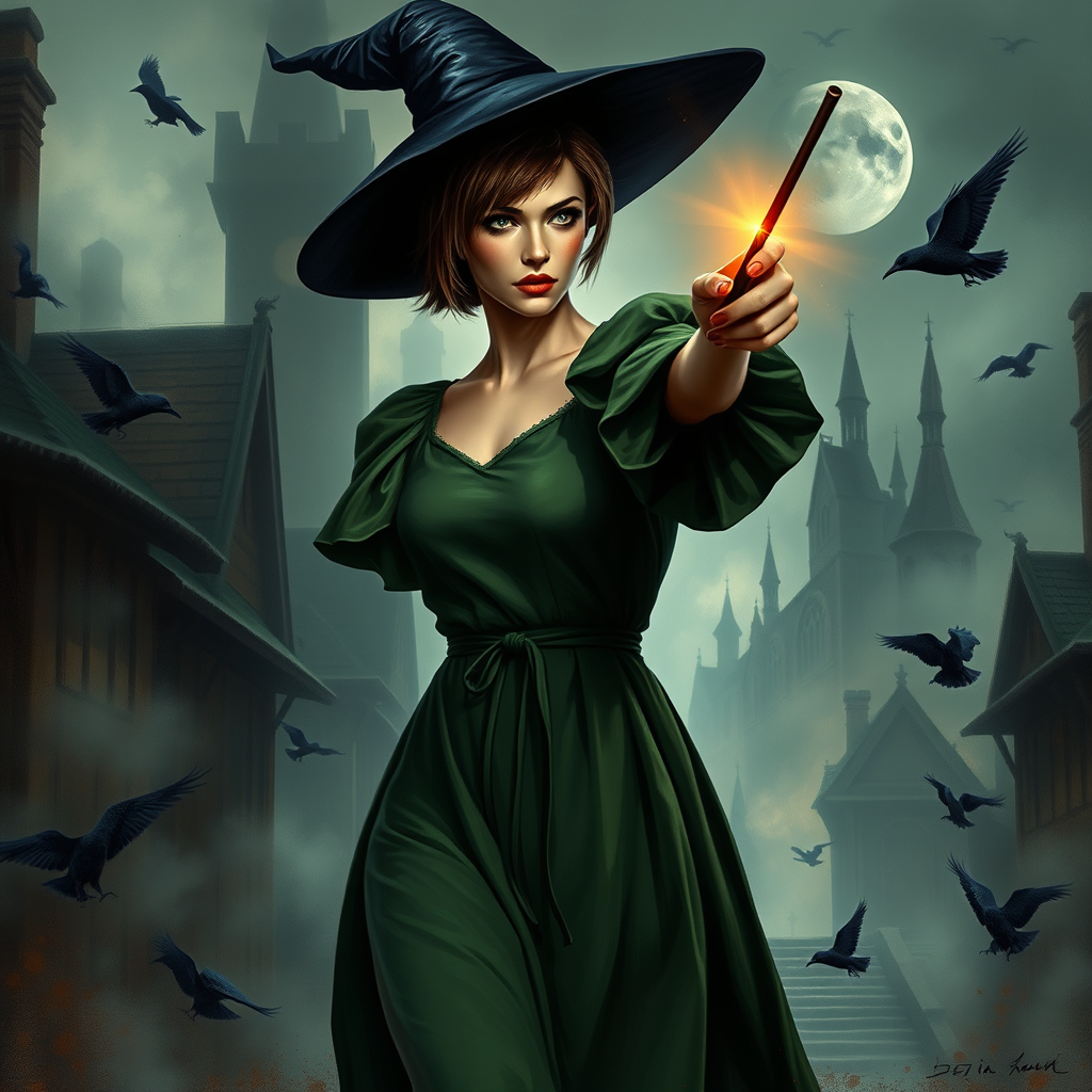 Full body portrait of the world's most powerful witch, a beautiful witch woman with short hair casting a spell and walking towards the camera, aiming her wand. She has reflective eyes and wears makeup with mascara, highlighted by dramatic chiaroscuro lighting and rim lighting. She stands amidst a gothic Victorian town shrouded in fog, with crows flying around. Dressed in a green dress with puffy sleeves, she embodies a blend of majestic magical power and elegance. The scene is inspired by the works of artists like Waterhouse, John Constable, Jeremy Mann, and Greg Manchess, capturing the intricate detail and high drama of professional impressionism. The artwork is a professional oil painting that maintains mystical and surreal elements with an impressionist touch, trending on ArtStation and CGSociety.