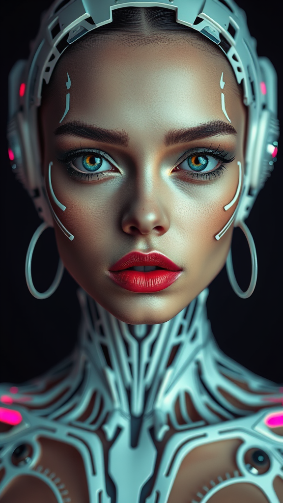 Full body portrait, ultra-realistic DMT-inspired fashion photoshoot featuring an exquisite model. Eyes wide open, digital abstract art piece, ethereal white DMT motif, bold and vibrant pop art elements, dynamic vray tracing, intricate zigzag patterns, refined elegance, expressive and emotive poses, robotic yet human expressionism, capturing an intense fusion of futuristic and artistic essence.