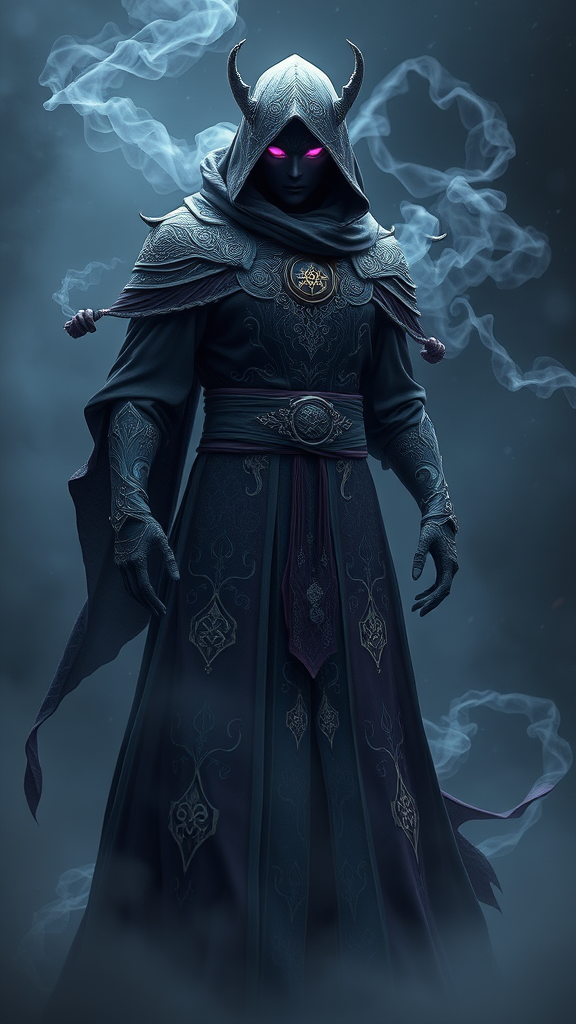 Full body shot of a void arcanist character design, enveloped in swirling mist, showcasing a photorealistic aesthetic with octane render quality, utilizing unreal engine technology for hyper detailed textures and volumetric lighting, set in a mystical fantasy realm with ethereal elements. The scene captures the enigmatic presence of the arcanist, with intricate patterns and shimmering sigils etched into their robes, their eyes aglow with arcane energy, and wisps of dark mist trailing their movements, adding a sense of mystique and otherworldly allure to the character.