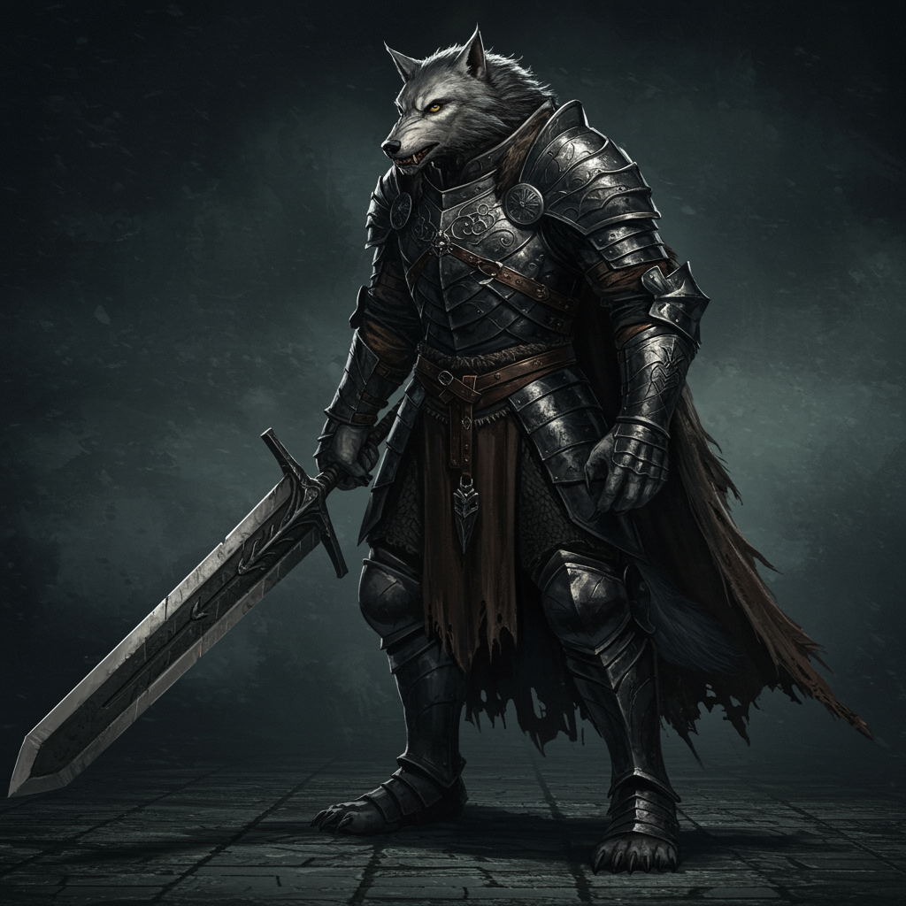 Full body shot of a werewolf warrior inspired by Blaidd from Elden Ring, wielding a massive sword and clad in dark, intricately detailed armor. Set in a dark fantasy ambiance, this digital artwork emphasizes a realistic, cinematic lighting style. The werewolf stands solo, showcasing perfect anatomy with a detailed snout. Despite being hyper-detailed, the artwork retains a hint of intentional imperfections like slight text errors or blur reminiscent of JPEG artifacts, lending an aged feel. The scene excludes elements like nudity, malformed hands, or any artist markings, focusing instead on the powerful, mythical presence of the werewolf.
