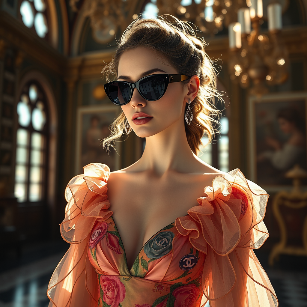 Full body shot of a young woman in dark sunglasses, adorned in elegant Chanel strappy high heels and a magnificent multicolored Dior gown, set in an intricate scene reminiscent of Joaquin Sorolla's artwork. Bathed in soft natural light, her face glows with the warmth of sunshine. Captured through an 85mm lens, the cinematic lighting enhances the scene, with luminous reflections creating a stunning hyperrealistic photograph. The setting is an exquisite environment, using cgi with octane render and raytracing to bring it to life.