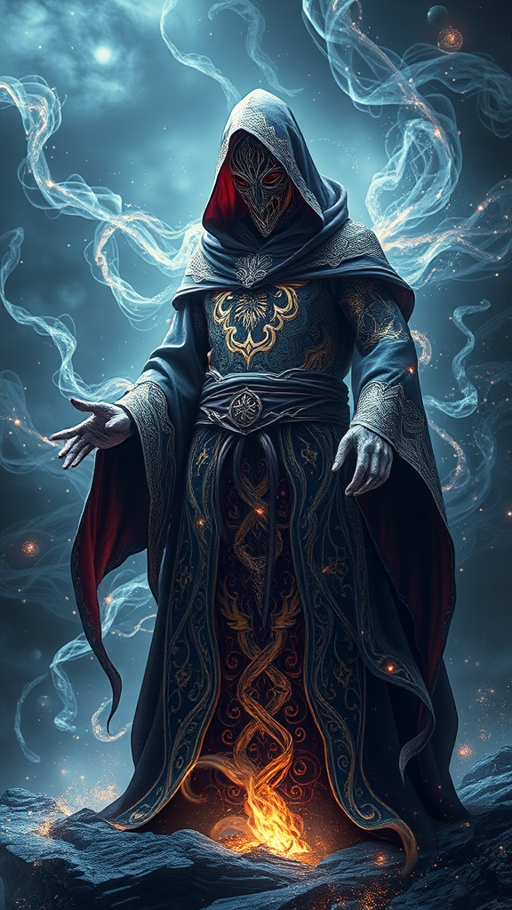 full body shot of an enigmatic void arcanist, adorned in intricate robes woven with ethereal patterns, surrounded by swirling arcane energies and shimmering particles, hyper detailed fantasy art with deep atmospheric depth, stunning volumetric lighting creating a mystical glow, set in an enigmatic landscape that merges reality and fantasy, rendered with a cinematic quality and dramatic contrast, capturing the mysterious allure and power of this arcane figure.