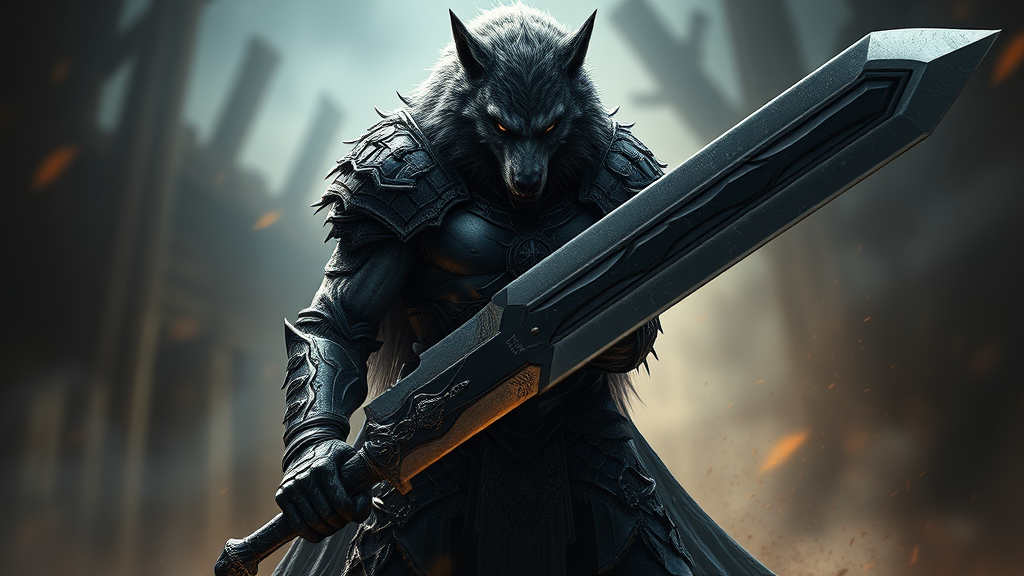 Full body shot of Blaidd the werewolf from Elden Ring, depicted as a powerful werewolf wielding a massive sword, clad in dark, intricately detailed armor. Set in a dark fantasy ambiance with a realistic and cinematic lighting style. The focus is on a solo male figure, crafted in digital art with hyper-detailed features, emphasizing perfect anatomy and a detailed snout. The image includes elements of texture such as blurred areas and JPEG artifacts to give it an authentic, gritty feel. It may include signature-like patterns or marks that mimic watermarks or artist signatures, contributing to an authentic and weathered aesthetic. Despite occasional imperfections, such as normal quality elements and hints of distorted or mutated anatomy, the core essence of a mythical, dangerous, and enigmatic character remains intact.