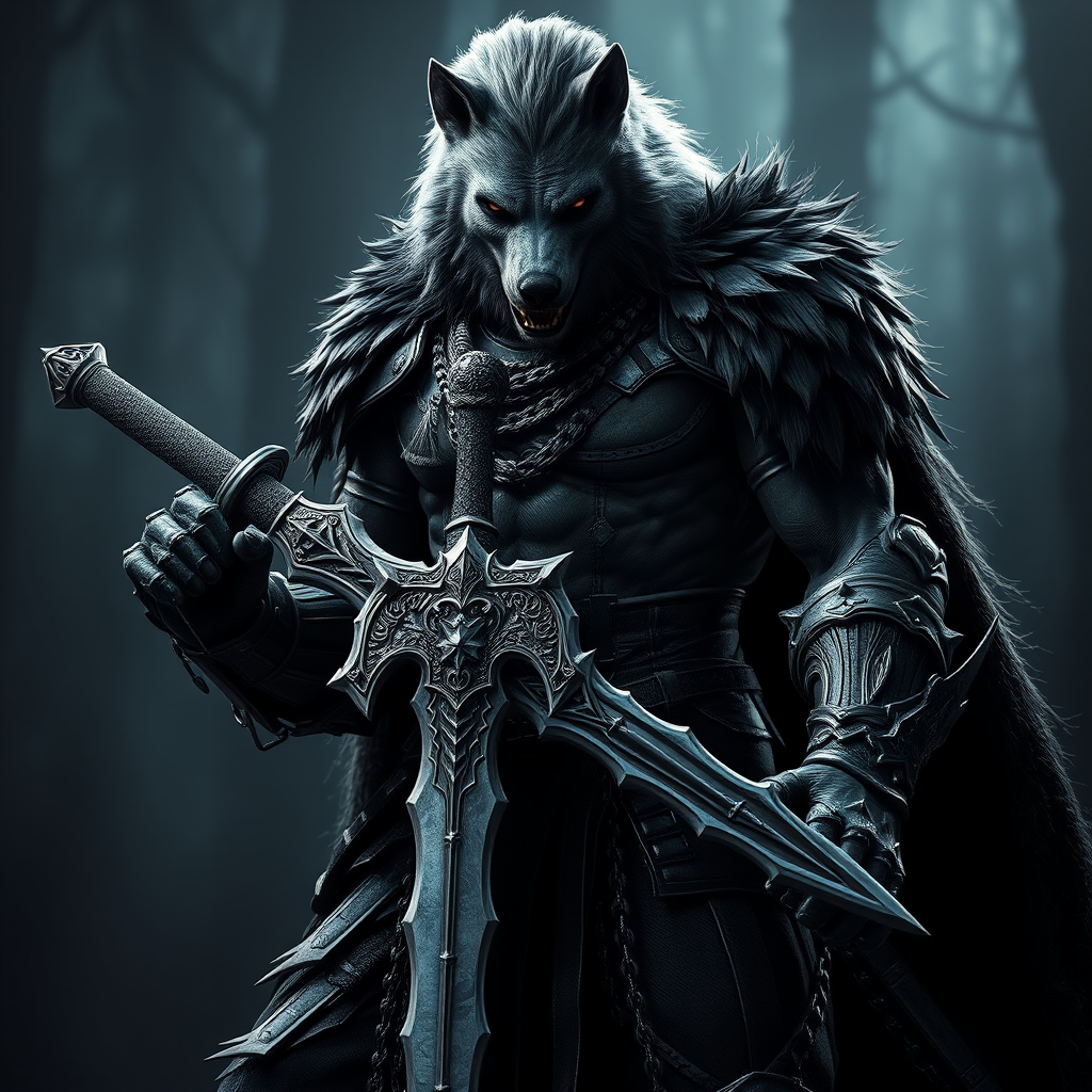 Full body shot of Blaidd the werewolf from Elden Ring, showcasing a fierce werewolf wielding a massive sword and clad in dark, intricately detailed armor. The scene captures an Elden Ring-inspired dark fantasy ambiance, with realistic and cinematic lighting highlighting the character's perfect anatomy and detailed snout. This digital art piece presents a hyper-detailed portrayal of a solo male figure, combining elements of realism and fantasy. Textures are rich and vivid, avoiding errors, blurriness, or low-quality aspects. The composition maintains sharp clarity with no signature, watermark, or artist's name, ensuring a focus on Blaidd's powerful and imposing presence.