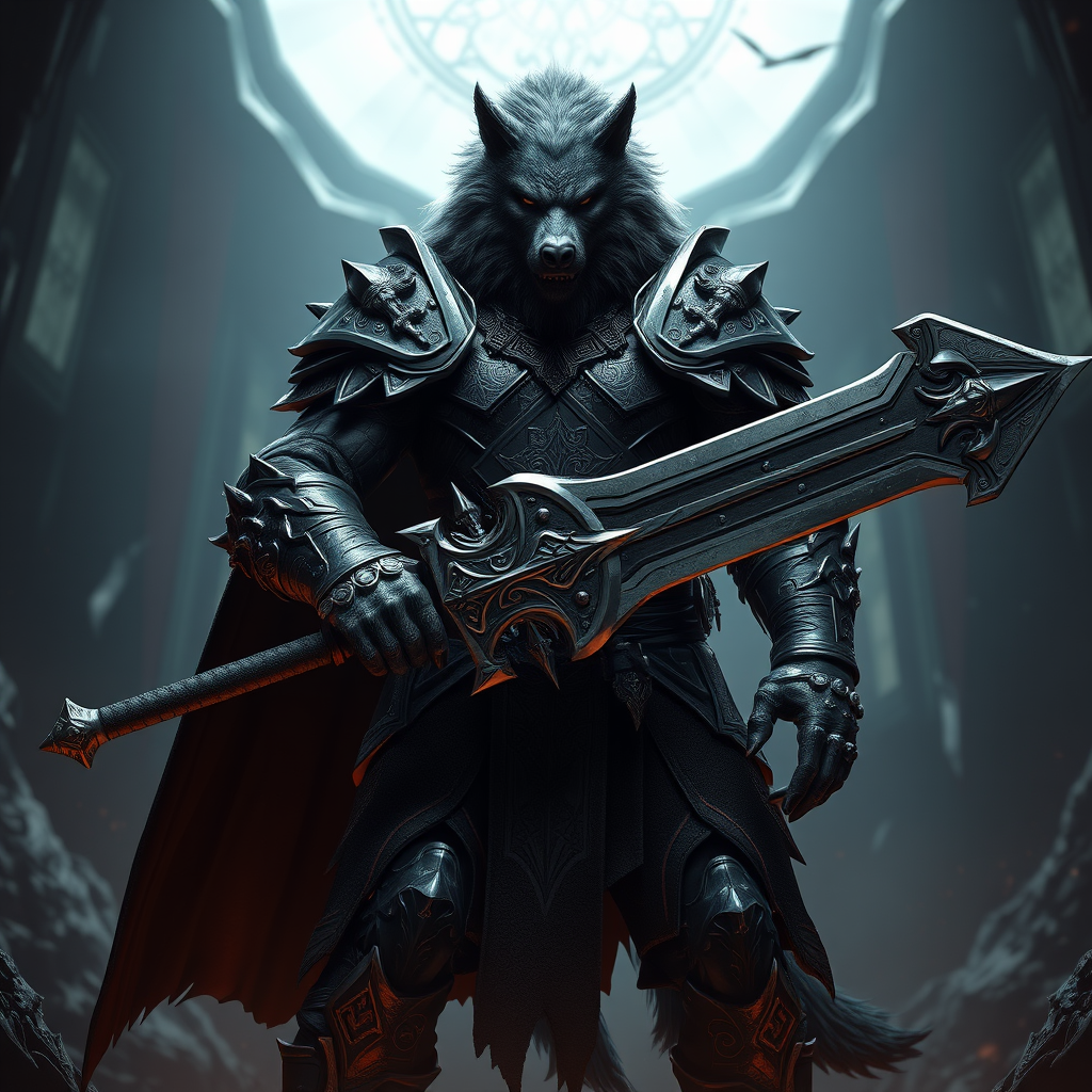 Full body shot of Blaidd the werewolf from Elden Ring, featuring a powerful werewolf with a large sword and dark, ornate armor. Set in a dark fantasy ambiance, the scene is realistic with cinematic lighting, focusing on a solo male character in digital art style, highlighting hyper-detailed features. Blaidd exhibits perfect anatomy with a detailed snout. Despite the intricate design, elements like watermarks, errors, blurriness, and JPEG artifacts subtly blend into the background. The image is free from any visible text or signatures, while avoiding bad anatomy, malformed or mutated hands, and nudity, ensuring a focus on the character's formidable presence.