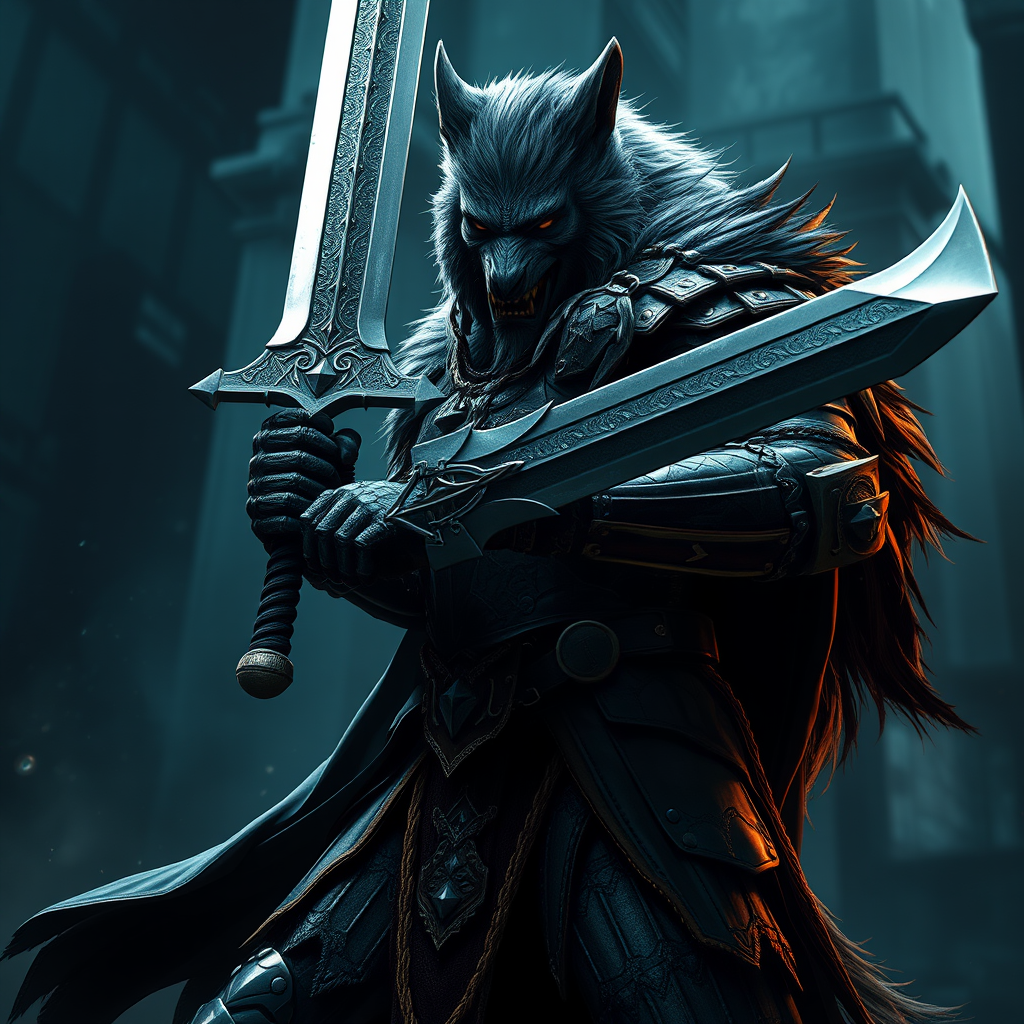 Full body shot of Blaidd the werewolf from Elden Ring, featuring a powerful werewolf wielding a large sword and clad in dark armor. The artwork showcases intricate details within a dark fantasy ambiance, with realistic and cinematic lighting highlighting the scene. The focus is on a solo male figure, depicted in detailed digital art with perfect anatomy. The scene captures a hyper-detailed portrayal of Blaidd, emphasizing a well-defined snout and an imposing presence. Despite the digital format, the image maintains high quality with no visible artifacts or distortions, ensuring a clean and immersive visual experience.