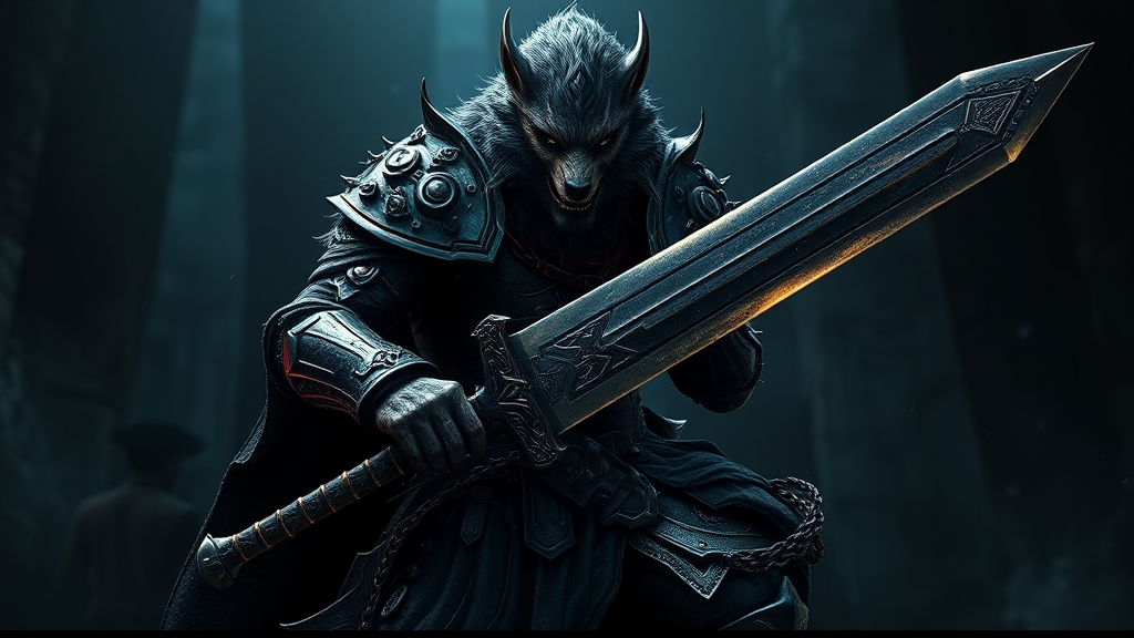 Full body shot of Blaidd the werewolf from Elden Ring; a powerful werewolf bearing a massive sword and clad in dark, intricately detailed armor. Set within a dark fantasy ambiance, the image is realistic with cinematic lighting, capturing a solo male figure in digital art. Featuring hyper-detailed elements, the character displays perfect anatomy with a detailed snout. Despite the detailed rendering, the image contains imperfections like text errors, blurry sections, JPEG artifacts, and cropped edges, creating an impression of varying quality. Though marked with a signature, username, or artist name, the character stands out despite slight distortions in anatomy, including malformed or mutated hands.
