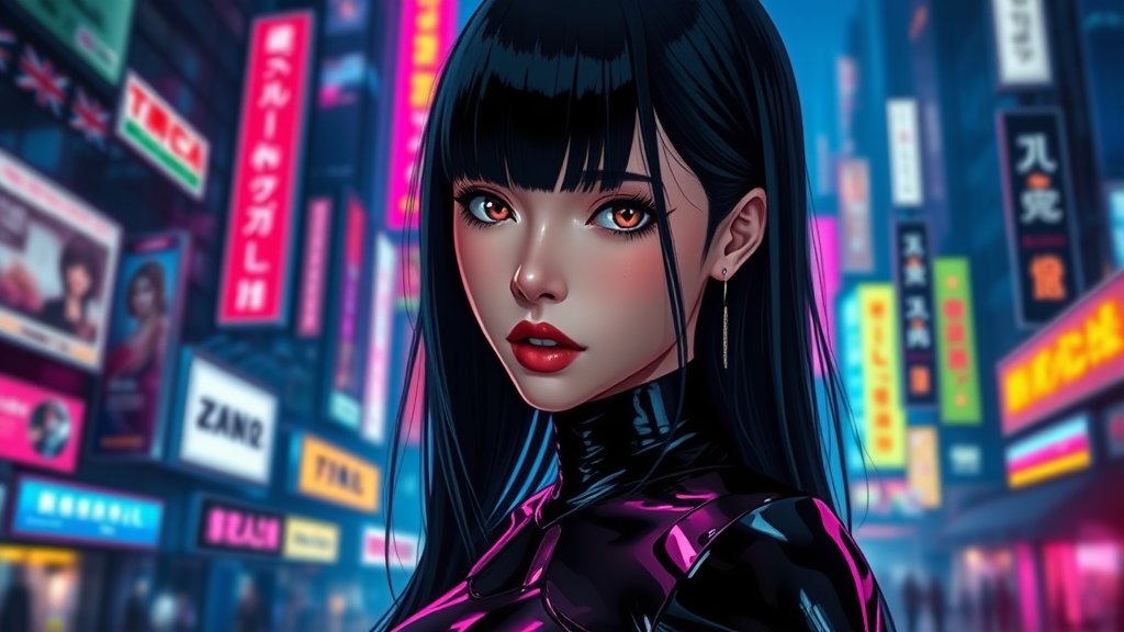 Full body shot of Reika, sleek black latex bodysuit, flowing straight black hair, set against a vibrant cyberpunk cityscape inspired by Gantz and Cyberpunk 2077. Ultra-realistic and breathtaking composition, emphasizing her exquisite, jewel-like eyes. Neon lights and chiaroscuro effects highlight her intricate and stunning features. Anime style blended with cinematic quality captures her vibrant presence. The backdrop pulsates with life, detailed reflections, and atmospheric depth. Her face, a masterpiece of beauty and detail, exudes sophistication. The scene, vibrant and immersive, embodies the futuristic allure of a highly detailed and richly textured visual tapestry.