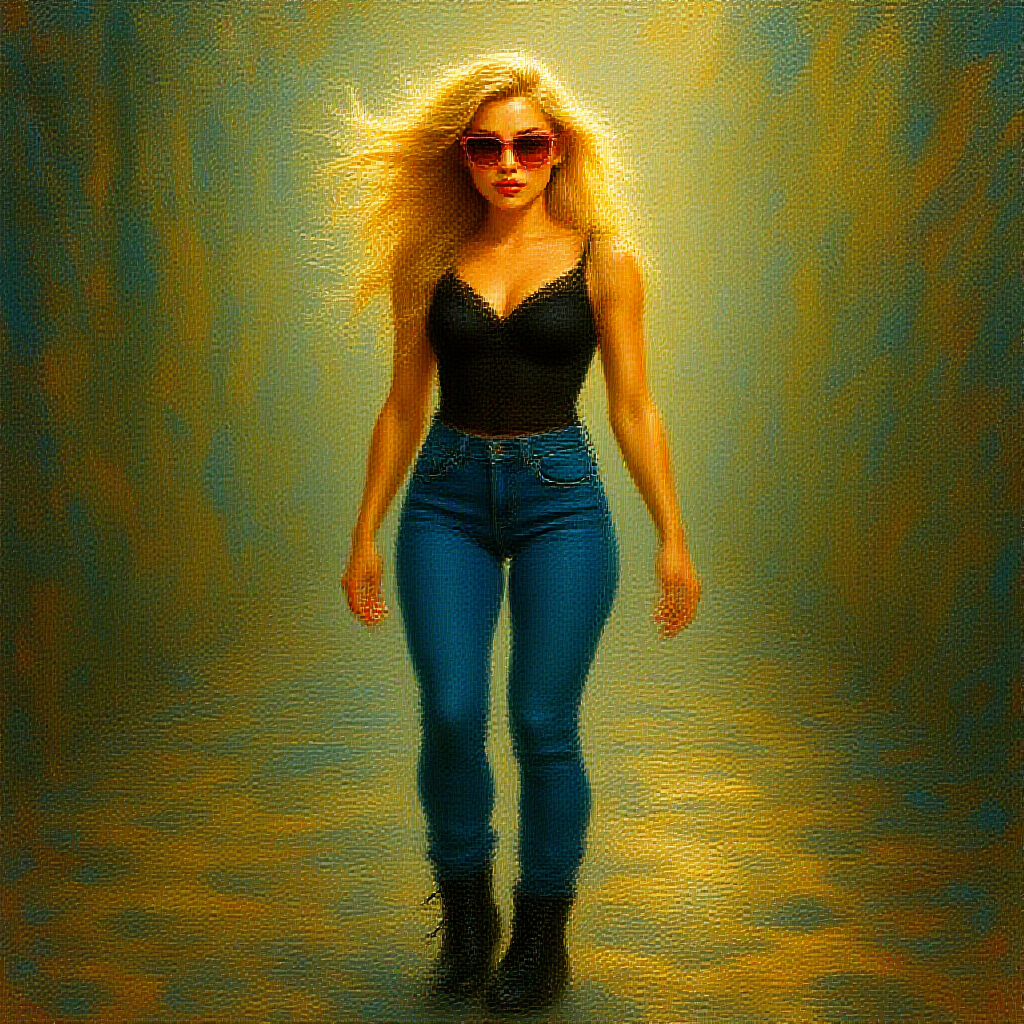 Full body shot portrait of a young woman in a black lace top, high waisted denim jeans, and sleek black leather boots, styled with rose-tinted sunglasses that lend a chic, futuristic vibe reminiscent of the Matrix. Her wavy blonde hair catches the gentle sunlight, emphasized through spontaneous brush strokes that capture her dynamic energy. The scene is bathed in soft natural light, with an 85mm lens capturing the luminous play of sunshine on her form. This impressionistic painting-like setting showcases a vibrant, bright color palette accentuating movement and light. The environment is strikingly cinematic, enhanced by lumen reflections and detailed hyperrealism, produced with cutting-edge CGI techniques using octane render and raytracing, creating a dynamic and stunning visual atmosphere.