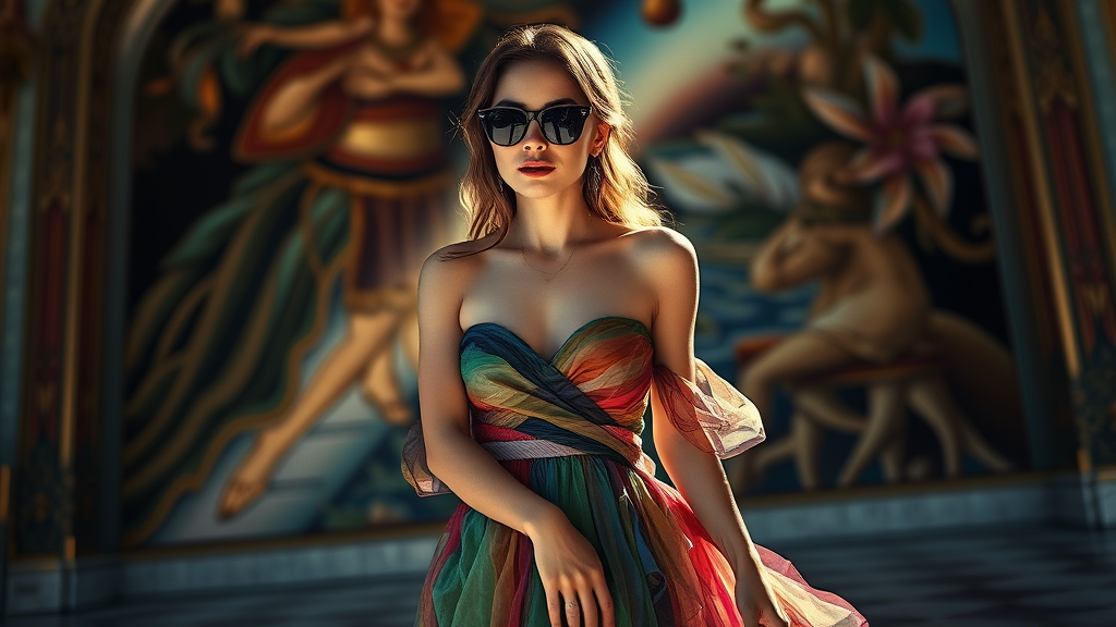 full body shot portrait of a young woman in dark sunglasses elegantly poised in chanel strappy high heels a stunning multicolored dior dress draping around her intricate artwork inspired by Joaquin Sorolla soft natural light caressing her features 85mm lens capturing the sunshine on her face cinematic lighting creating luminous reflections the photography capturing a breathtaking environment infused with hyperrealism rendered in cgi with octane raytracing technology --v 4 --style 4c --ar 4:7