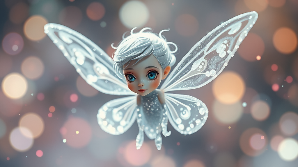 Full body, small, highly detailed incorporeal fairy made of silvery light, surrounded by bokeh pollen specks and multicolored magic particles in the air, inspired by Moebius. The fairy has a perfectly lifelike, beautiful face with detailed, pretty eyes and glossy lips. Set against a pastel bloom lighting for enhanced detail, the scene is beautifully rendered in an aesthetic reminiscent of FromSoftware Artwork and Elden Ring, featuring a boss stage battle intensity. Ray tracing beams enhance the environment with extremely smooth blending, showcasing a highly detailed illustration in 8k sharp focus. The composition is flawless with realistic anatomy and proportions. The fairy is balanced in its pose, with a centered composition that highlights its enchanting presence. The overall image is clear and well-defined, capturing the delicate beauty and ethereal charm of the fairy in an artistic masterpiece.
