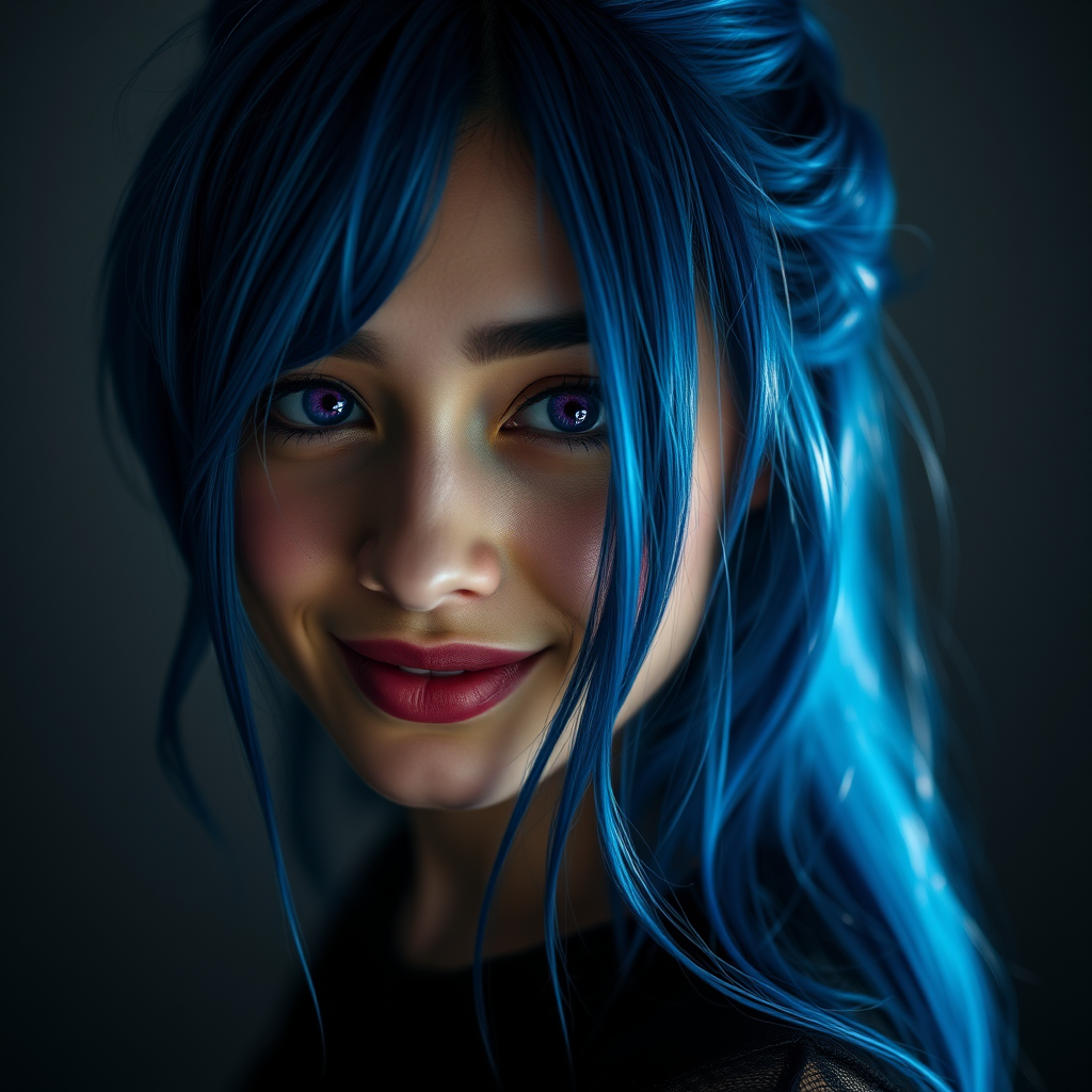 Full body studio portrait of a young woman with intricately detailed blue hair and a playful smirk, her bright violet eyes filled with mystery and catching the low light. The photograph is ultra-realistic, captured with exquisite detail, as if shot on a Leica SL2 with a 105mm lens at f/5.6. Inspired by the artistry of Irving Penn and Annie Leibovitz, and skillfully retouched for depth and texture. The atmosphere carries a blend of enigmatic allure and captivating realism.