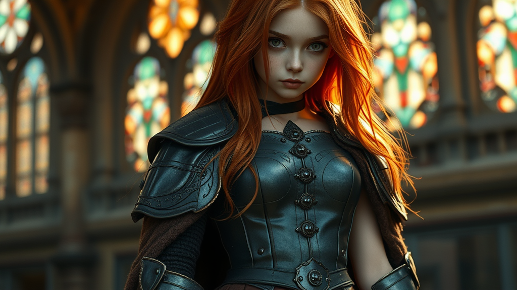 Full body three-quarter close-up, dark fantasy movie style, stunningly beautiful slender girl, innocent face with fiery red long hair, dressed in intricately detailed damaged gothic knight's armor of blued steel, wearing a short skirt and tights. Her tattered dark brown wool cloak is superbly detailed, complementing the dramatic and gloomy atmosphere with its rough weave. Set against a hauntingly expressive background that enhances the natural blued steel texture and hyper-detailed elements, the scene is illuminated by the golden hour's natural light. Colorful reflections from stained glass add a cinematic touch, creating an ethereal glow. She wears a corset with decorative rivets, evoking a sense of medieval elegance. The setting includes circular windows, casting filtered light that adds an aura of mystery. The scene maintains a sense of symmetry with soulful anime-style eyes, yet avoids any distortions—her form is gracefully intact, with naked arms and neck presenting a blend of strength and vulnerability.