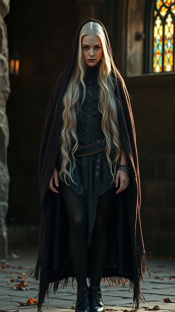 Full body three-quarter close-up, dark fantasy movie style, fiery white long hair, tights with a max long skirt, intricately detailed tattered dark brown wool cloak with a rough weave, dramatic background, gloomy and haunting atmosphere, natural blued steel texture, expressive and detailed background, hyper-photorealism, natural light during golden hour, natural reflections, natural textures, stained glass-like lighting, cinematic bright light, hints of gold, corset with rivets, elements of a nun, priest, or pastor, anime-inspired eyes, symmetry. Focus on creating a captivating character with a mysterious ambiance, ensuring realistic anatomy and proportions, avoiding distortions or unnatural features. The overall setting is atmospheric with touches of elegance and mystery, featuring natural and evocative lighting elements.
