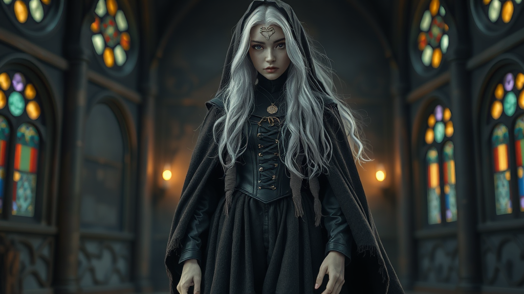 Full body three-quarter close-up, dark fantasy movie style, fiery white long hair, tights with max long skirt, exquisitely detailed tattered dark brown wool cloak with rough weave, dramatic background, gloomy and eerie atmosphere, natural blued steel texture, expressive background, super detailed, hyperphotorealism, natural light during golden hour, natural reflections, natural textures, stained glass illumination, colored glass lighting, cinematic lighting with intense brightness, gold accents, corset with rivets, portraying a nun, priest, or pastor, anime style with expressive eyes, symmetry, naked arms, neck, and hands, avoiding deformed or disfigured appearances, maintaining high-quality rendering without jpeg artifacts or mutations, focusing on well-proportioned anatomy, avoiding extra limbs or cloned features, ensuring clarity and realism without blurriness or gross proportions, watermark-free, with natural lighting playing through round windows, preserving a lifelike and vibrant expression.