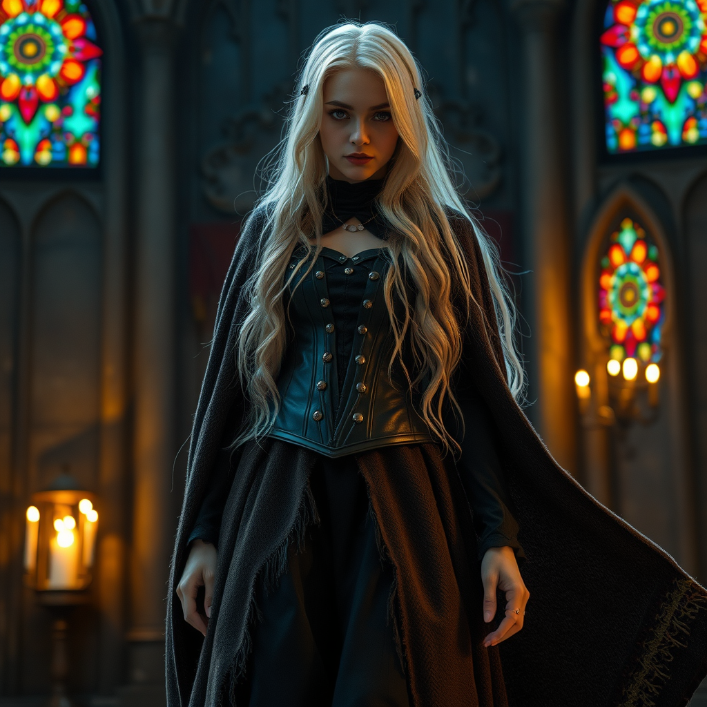 Full body three-quarter close-up, dark fantasy movie style, fiery white long hair, tights with a floor-length skirt, intricately detailed tattered dark brown wool cloak with a rough weave. The dramatic background enhances the gloomy and eerie atmosphere with a natural blued steel texture. The scene is captured in stunning hyperphotorealism during the golden hour, featuring natural reflections and textures. Stained glass lighting casts colorful hues, creating a cinematic and luminous ambiance. The costume includes a corset adorned with rivets, evoking a mystical aura. Influences from religious figures such as nun, priest, or pastor are subtly present. The character possesses anime-style eyes with symmetry and elegance. Raising the emotional expression, the scene is devoid of negative elements like disfigurements or poor quality art. An aura of mystery is maintained, focusing on the supernatural and the ethereal, with elements like natural light, circle motifs, and intricate details enhancing the setting.