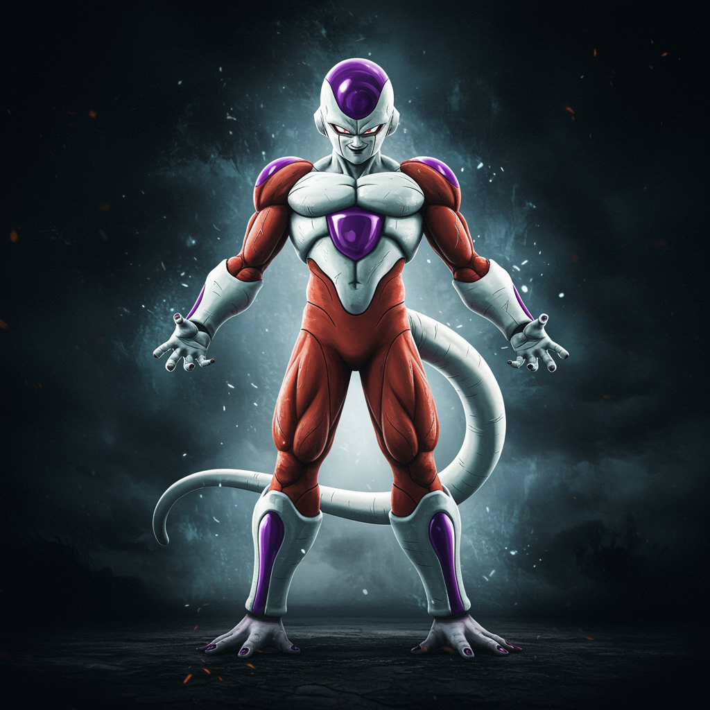 full body view full body shot ultra-wide angle depiction of a character inspired by frieza final form and advanced android technology ultra realistic highly detailed cinematic lighting with elements reminiscent of darth maul's intense presence and striking features enhanced with creative adaptations while maintaining the core essence