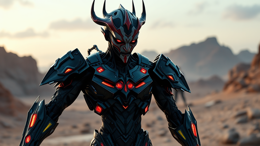 Full body view full body shot ultra-wide angle frieza final form android ultra realistic highly detailed cinematic lighting darth maul inspired sci-fi character with sharp angular features, futuristic armor, intricate textures, glowing energy elements, dramatic shadows, intense gaze, dynamic pose, alien landscape backdrop