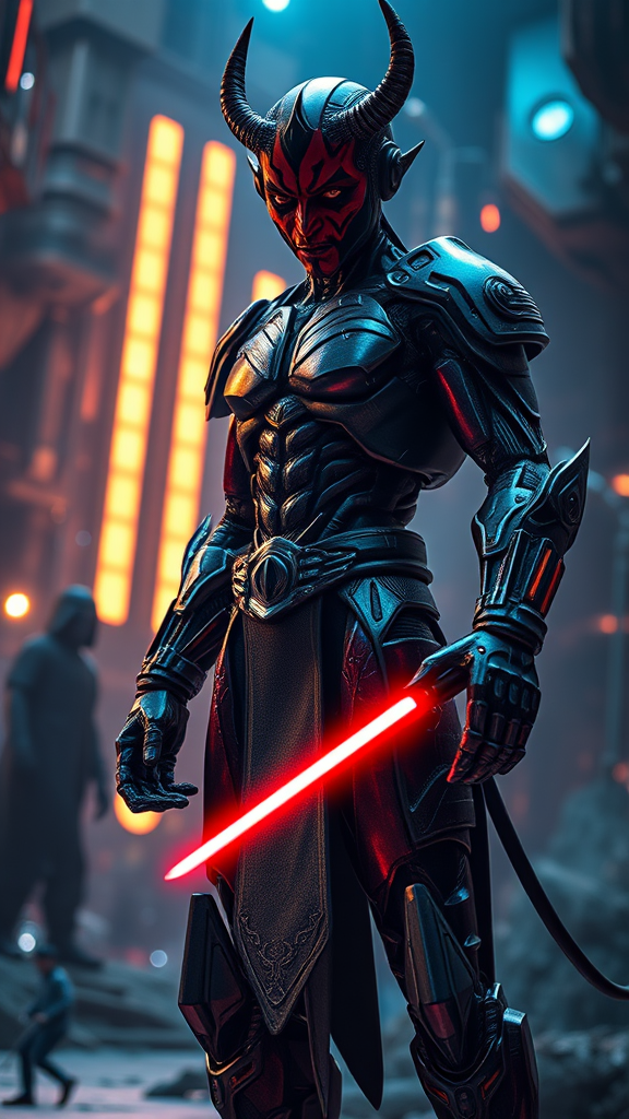 Full body view full body shot ultra-wide angle Frieza final form android ultra realistic highly detailed cinematic lighting Darth Maul inspired futuristic design imposing presence sci-fi elements intricate textures dramatic atmosphere vibrant color palette intense expression enhanced musculature futuristic environment.