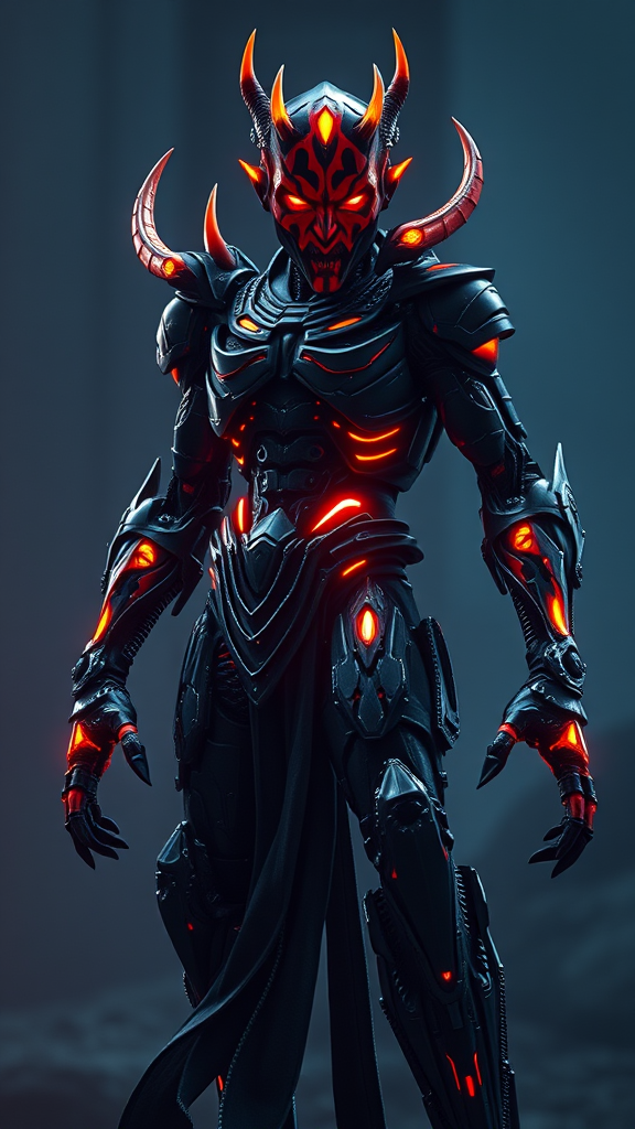 full body view full body shot ultra-wide angle frieza final form android ultra realistic highly detailed cinematic lighting darth maul inspired character with intricate patterns biomechanical features fierce expression glowing eyes dynamic pose vibrant colors dark atmosphere