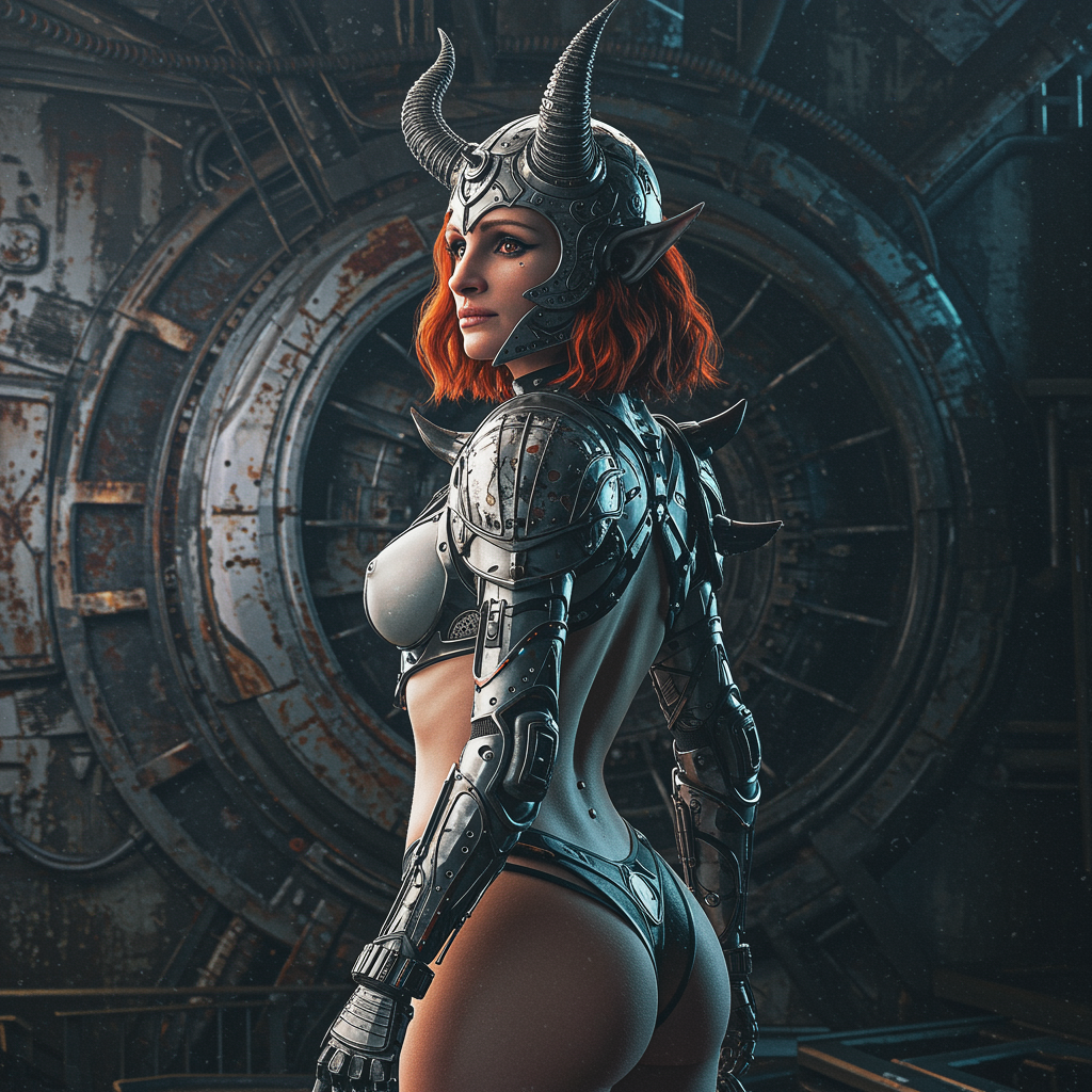 Full body view, Julia Roberts' likeness in profile, glancing over her shoulder, exuding glamorous kitsch appeal, high resolution, crafted with intricate wires, embracing grungecore aesthetics, donning elaborate armor as a strikingly beautiful orc warrior adorned with a devilish helmet featuring prominent horns, sporting an open cyber suit with a navel piercing, against the backdrop of an aged, rusty space station. The scene unfolds in dark white and subtle silver tones, capturing a captivating, mysterious allure reminiscent of Ferrania P30 film style. With influences from Earl Norem's mysterious beauty and the exaggerated features of dragon art by Royo and Giger, this fusion of sci-fi and cyberpunk creates a dark yet mesmerizing piece.